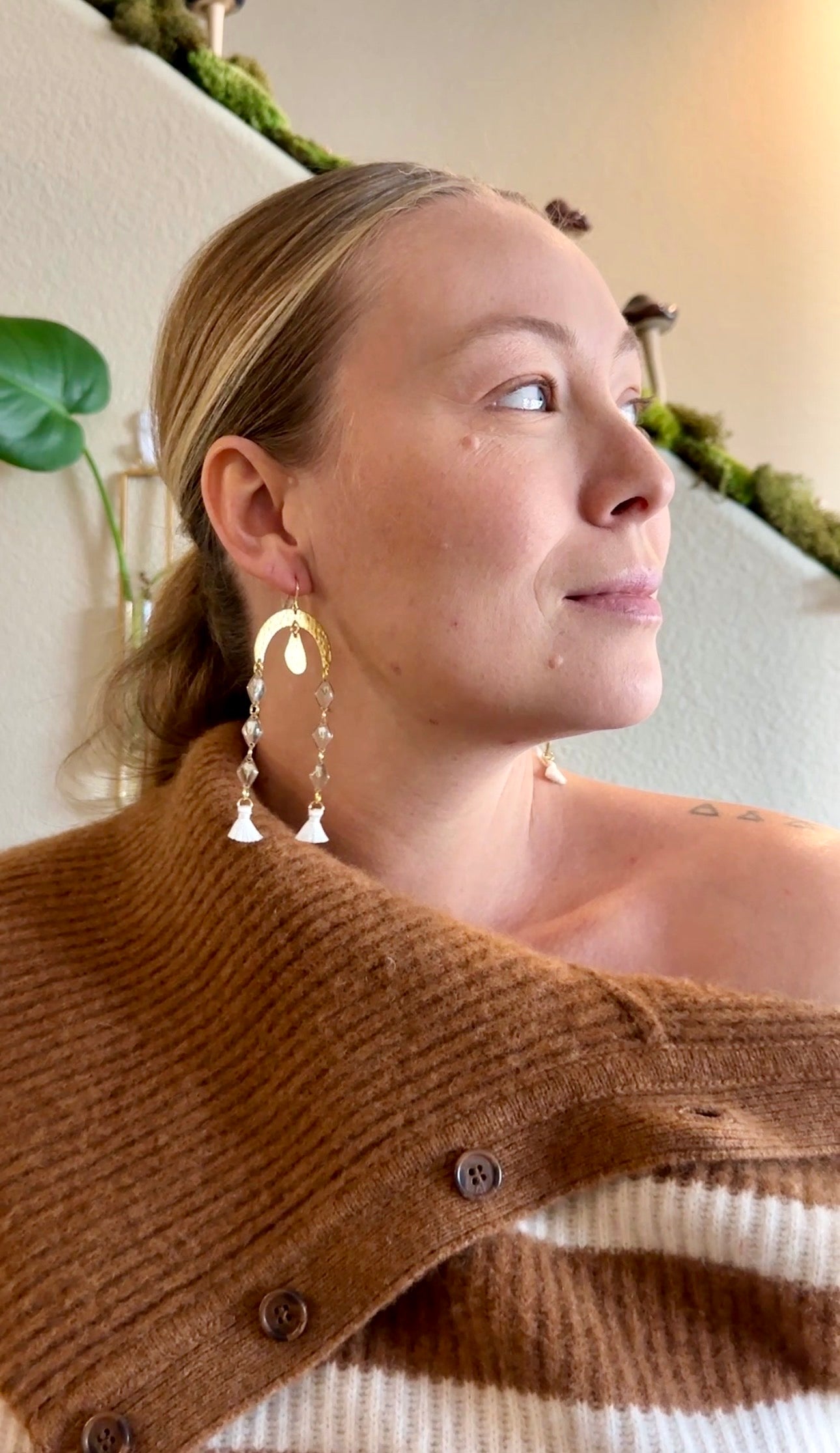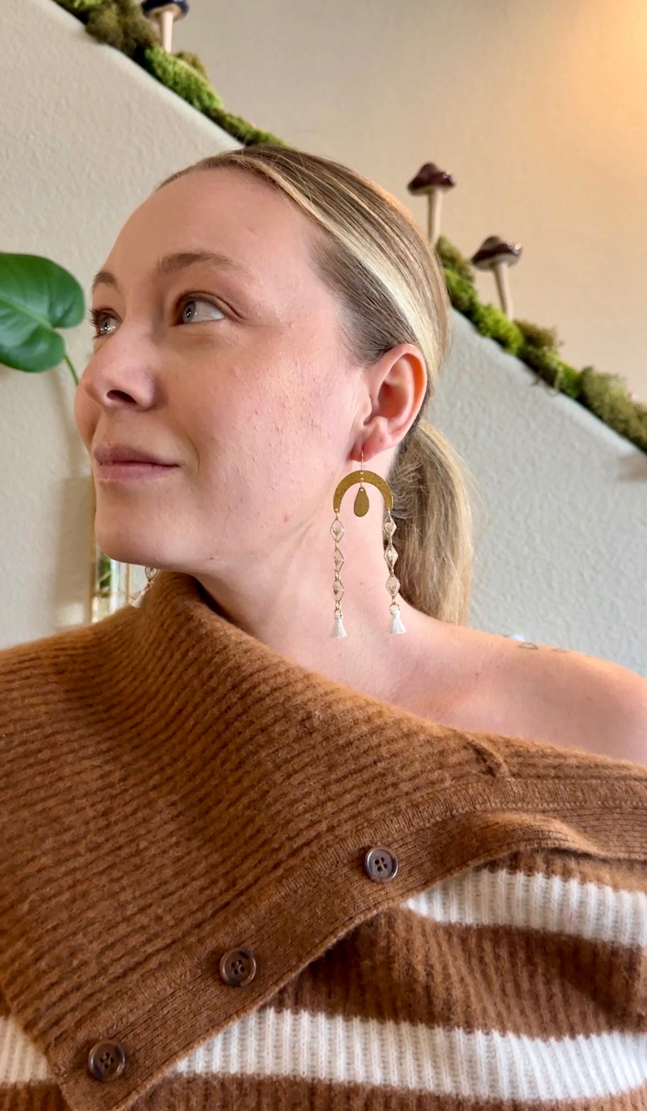 Preserved babies breathe in resin charms with hammered gold charms and white fringe on gold stainless steel earring hooks.