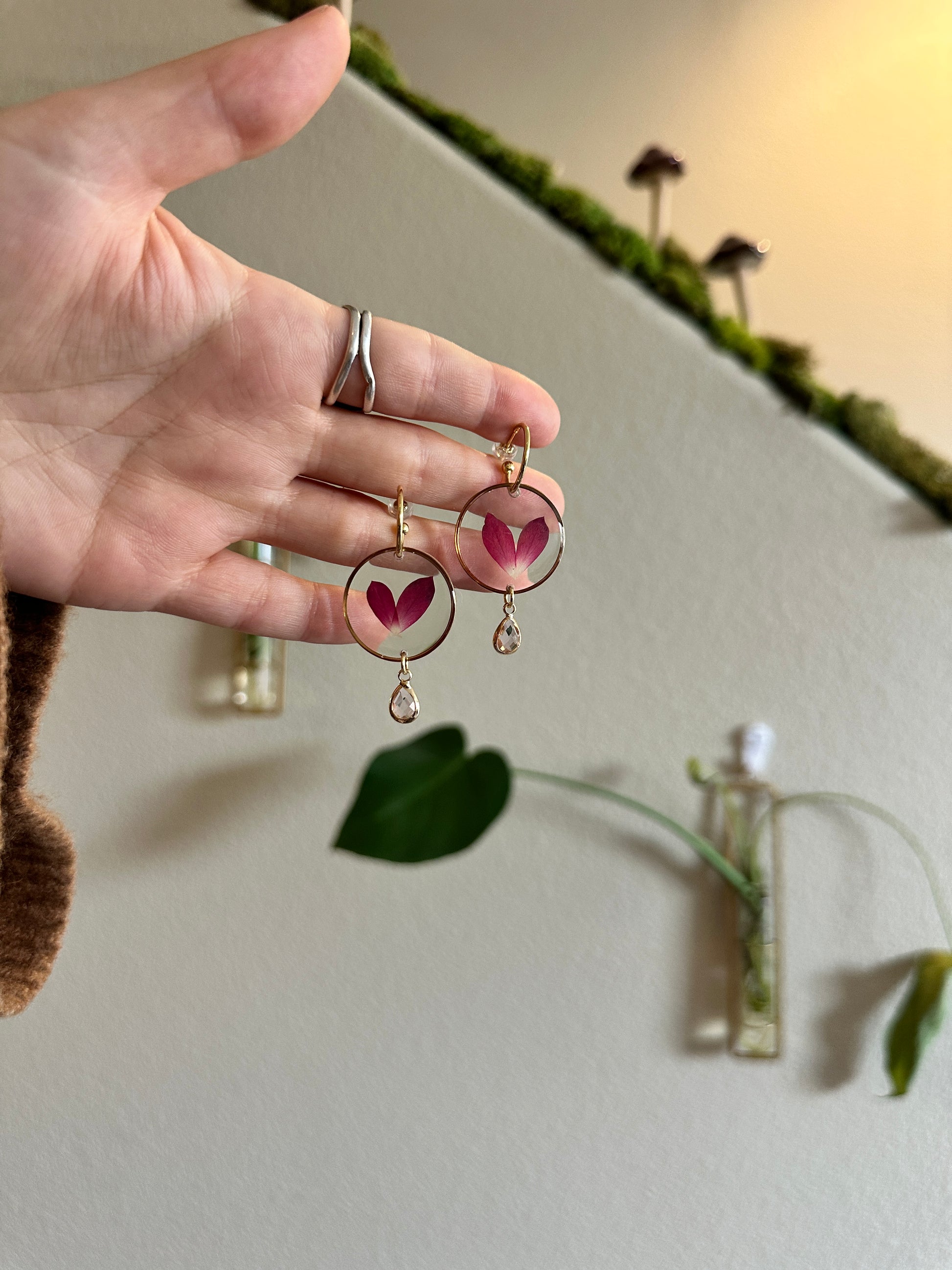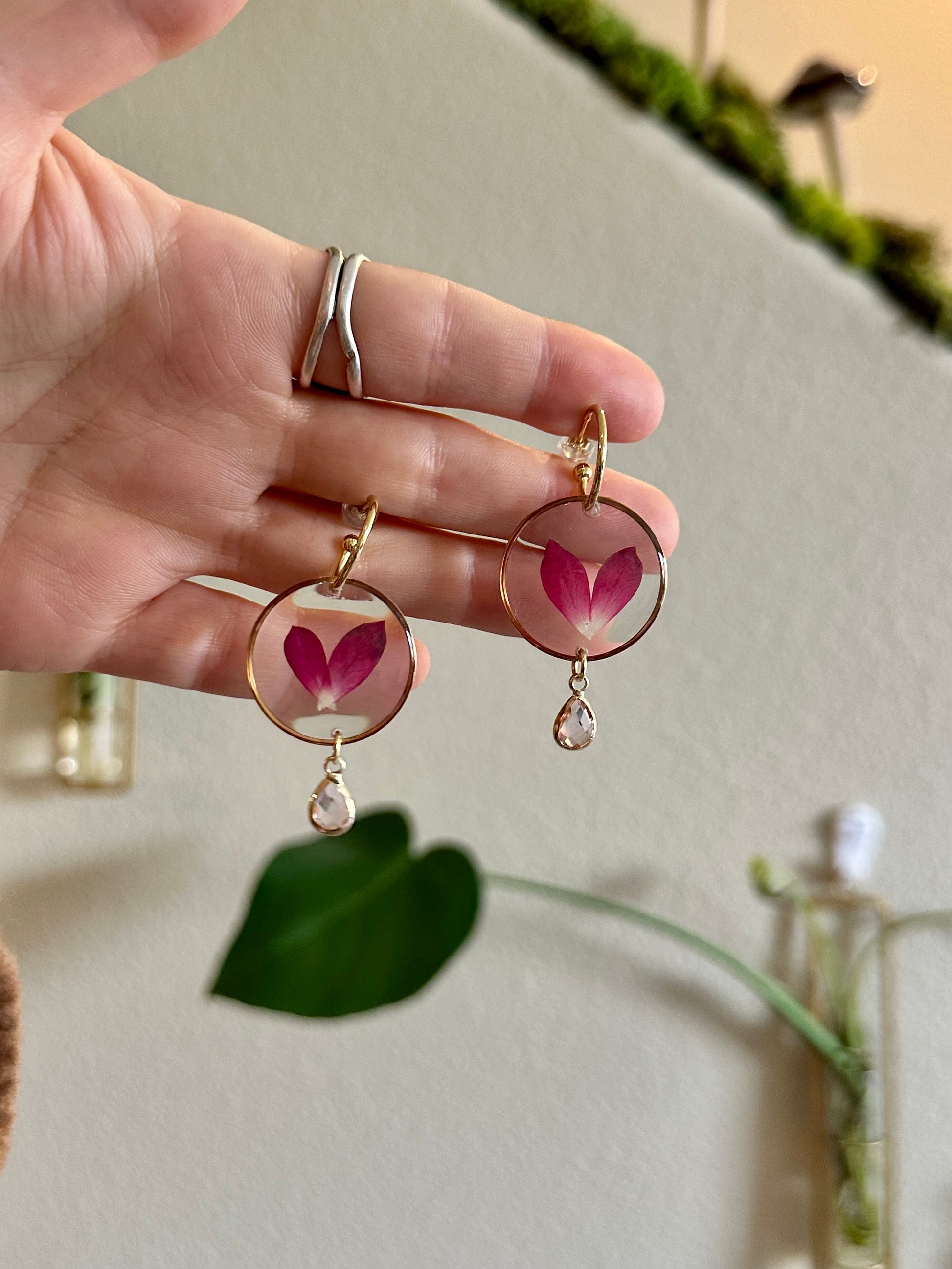 Pressed rose petals in resin charms on 14k gold filled Huggies and pink glass charms.