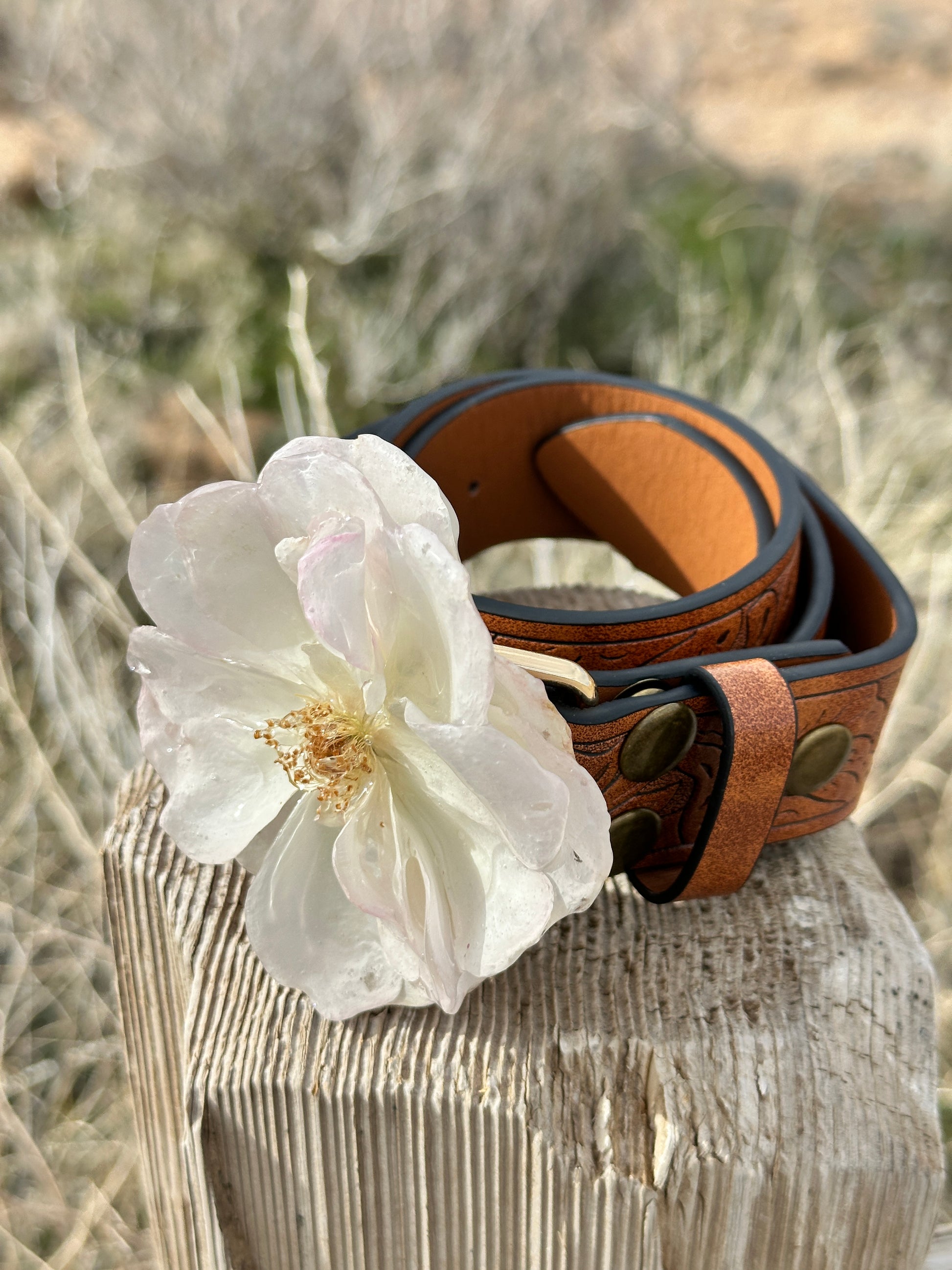 White garden roses preserved in resin on a removable 1 1/2” belt buckles. Belt comes with longhorn wildflower belt adjustable 35”-41”.