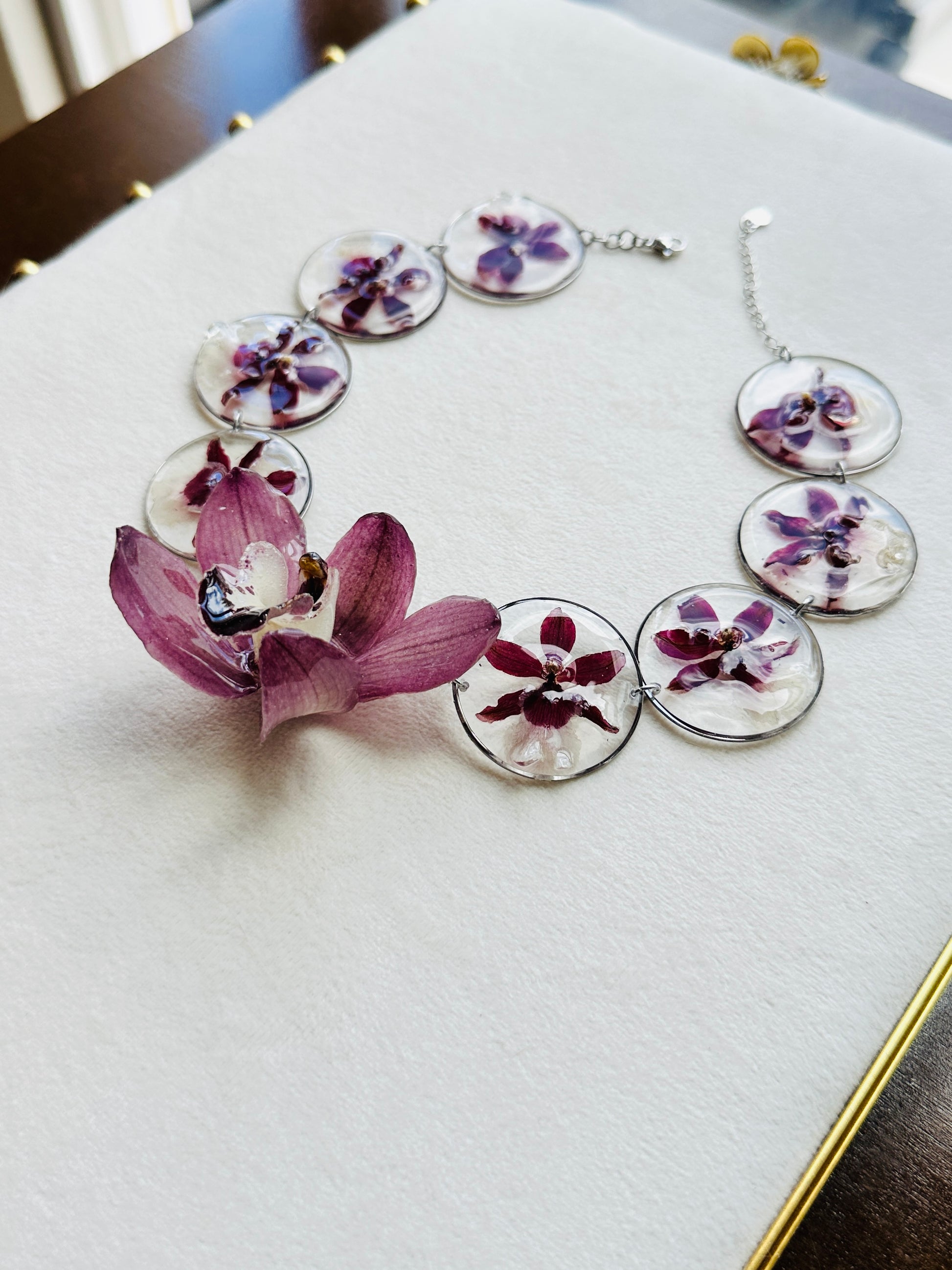 One of a kind choker necklace with mini orchids preserved in silver charms and one larger cymbidium orchid preserved in resin. Adjustable 13-14”