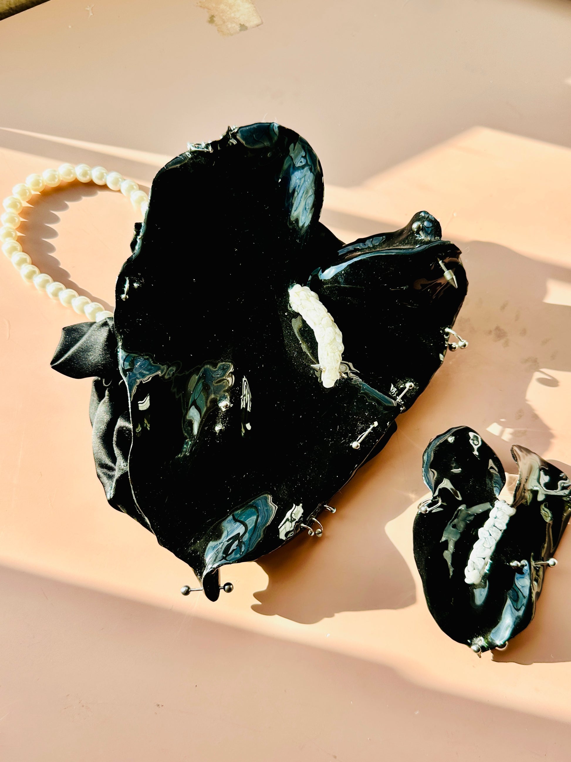 A real large anthurium preserved in resin and painted black with silver piercings and a moonstone stem. Faux pearl handle with a silk bag on the bag. Purse comes with matching clip! ✨🌚