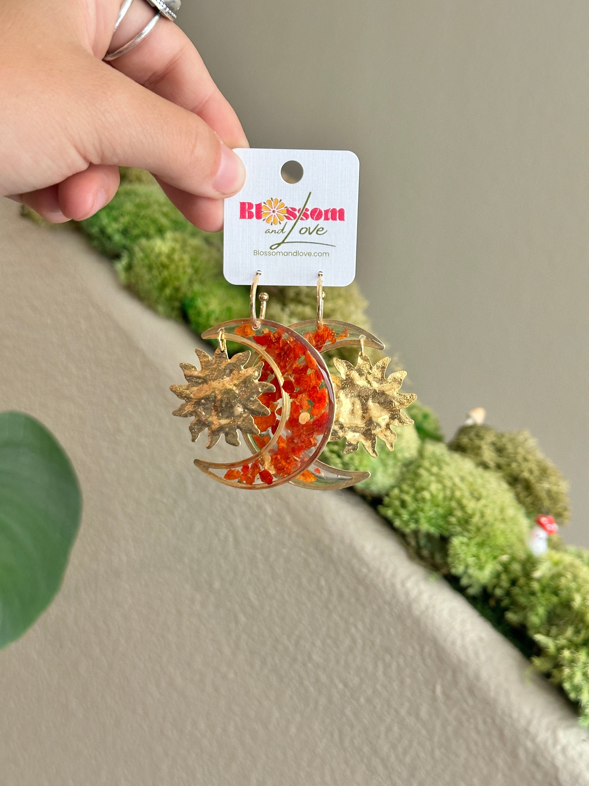 Crushed red pepper in brass moons with hammered gold sun charms on 14k gold filled Huggies.