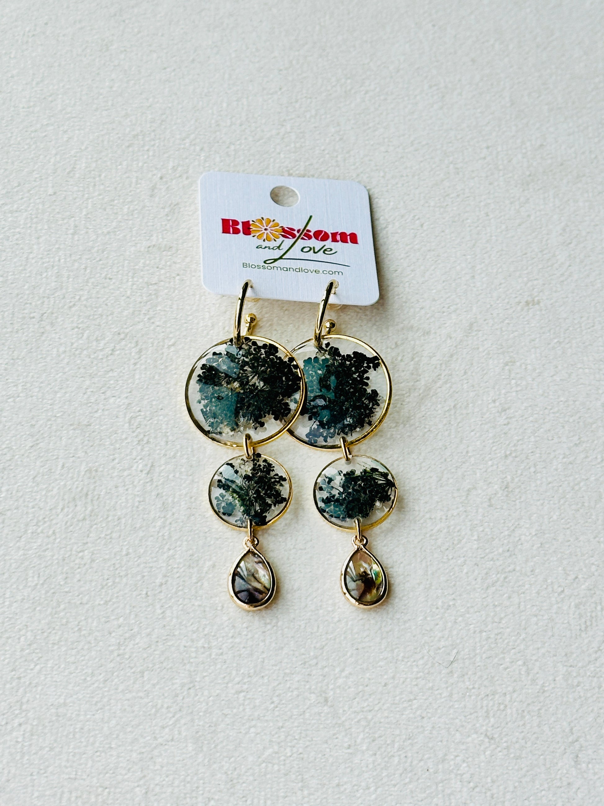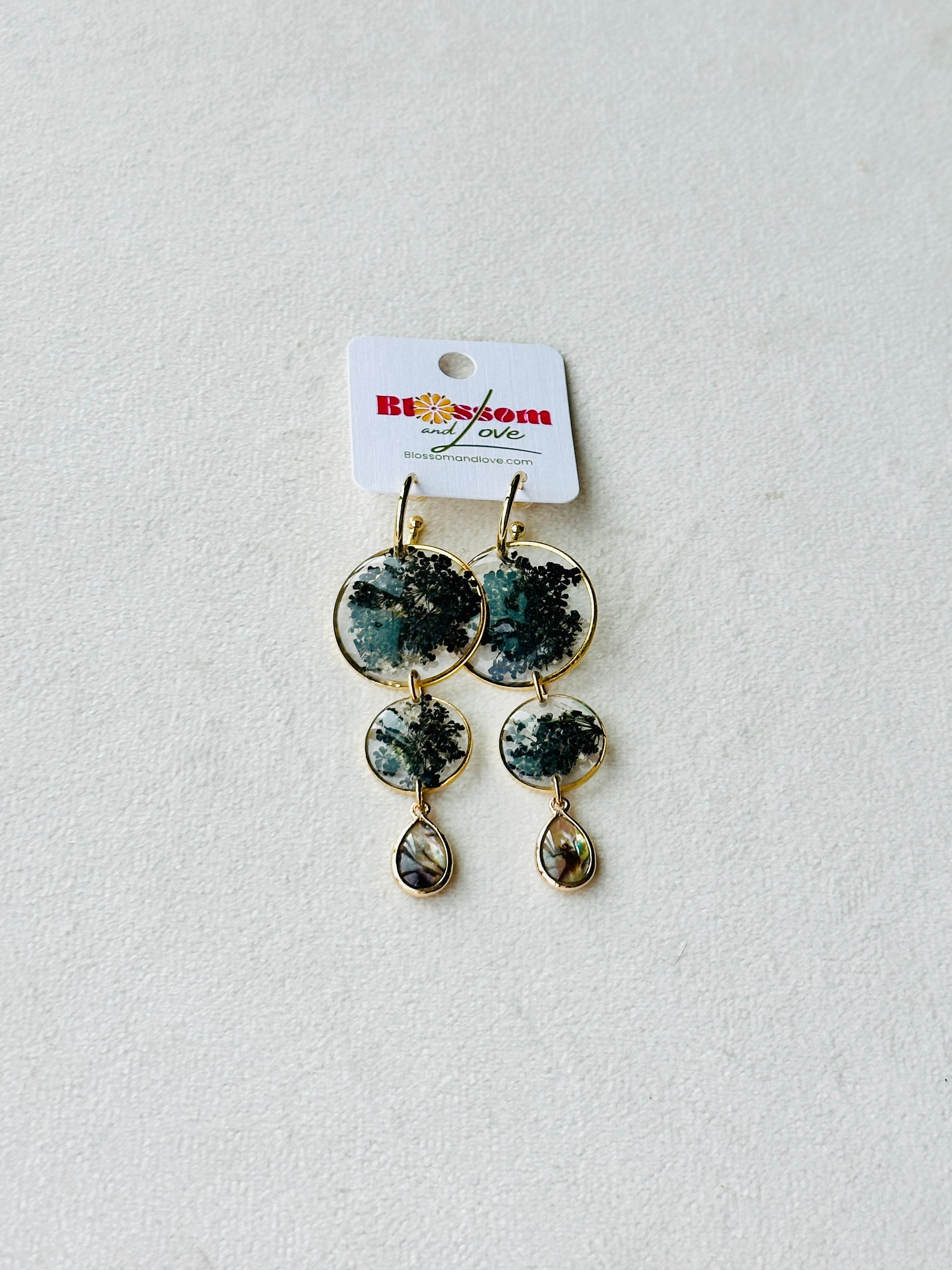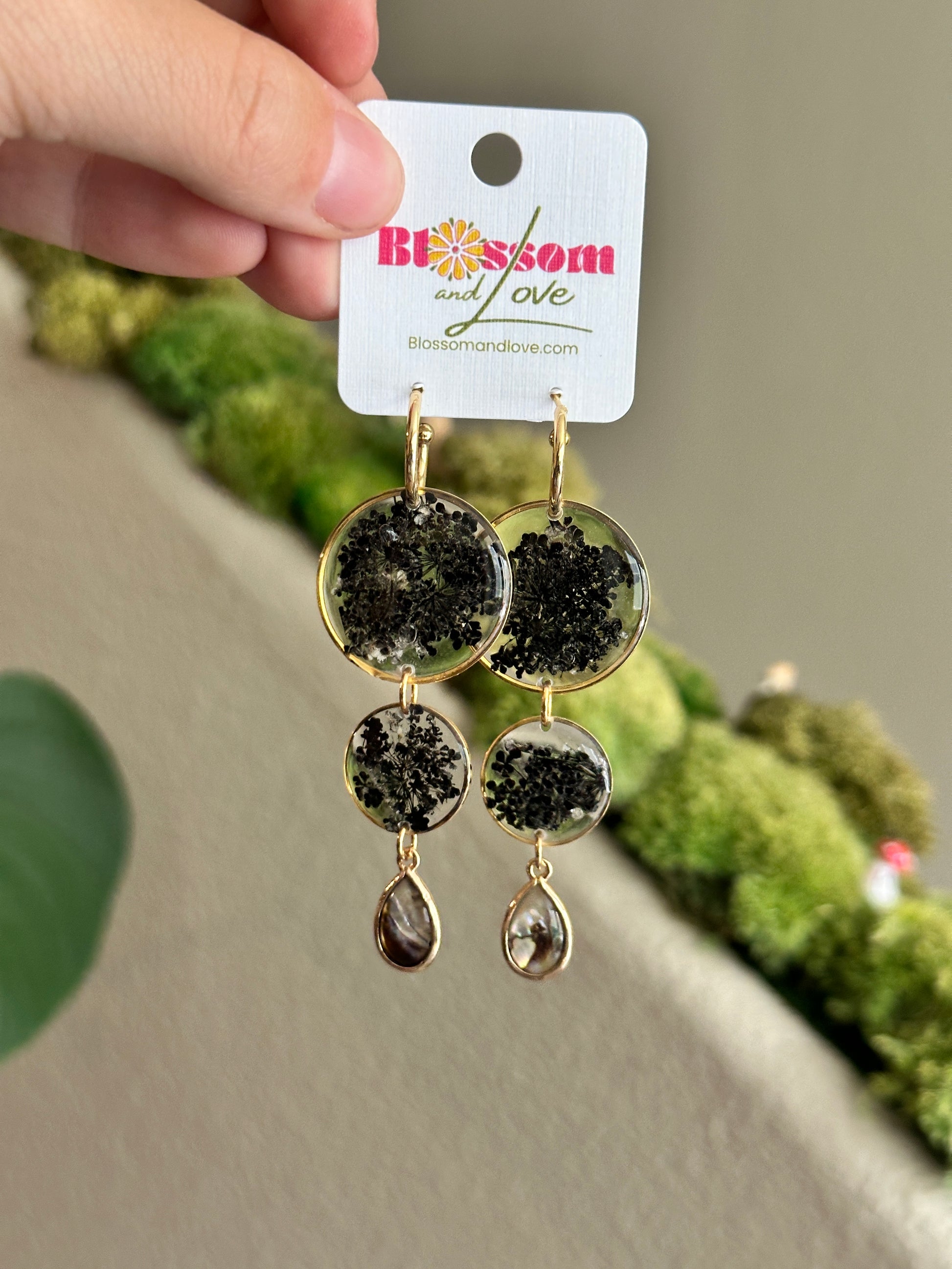 Pressed black queen Anne’s lace with abalone shell charms on 14k gold filled Huggies.