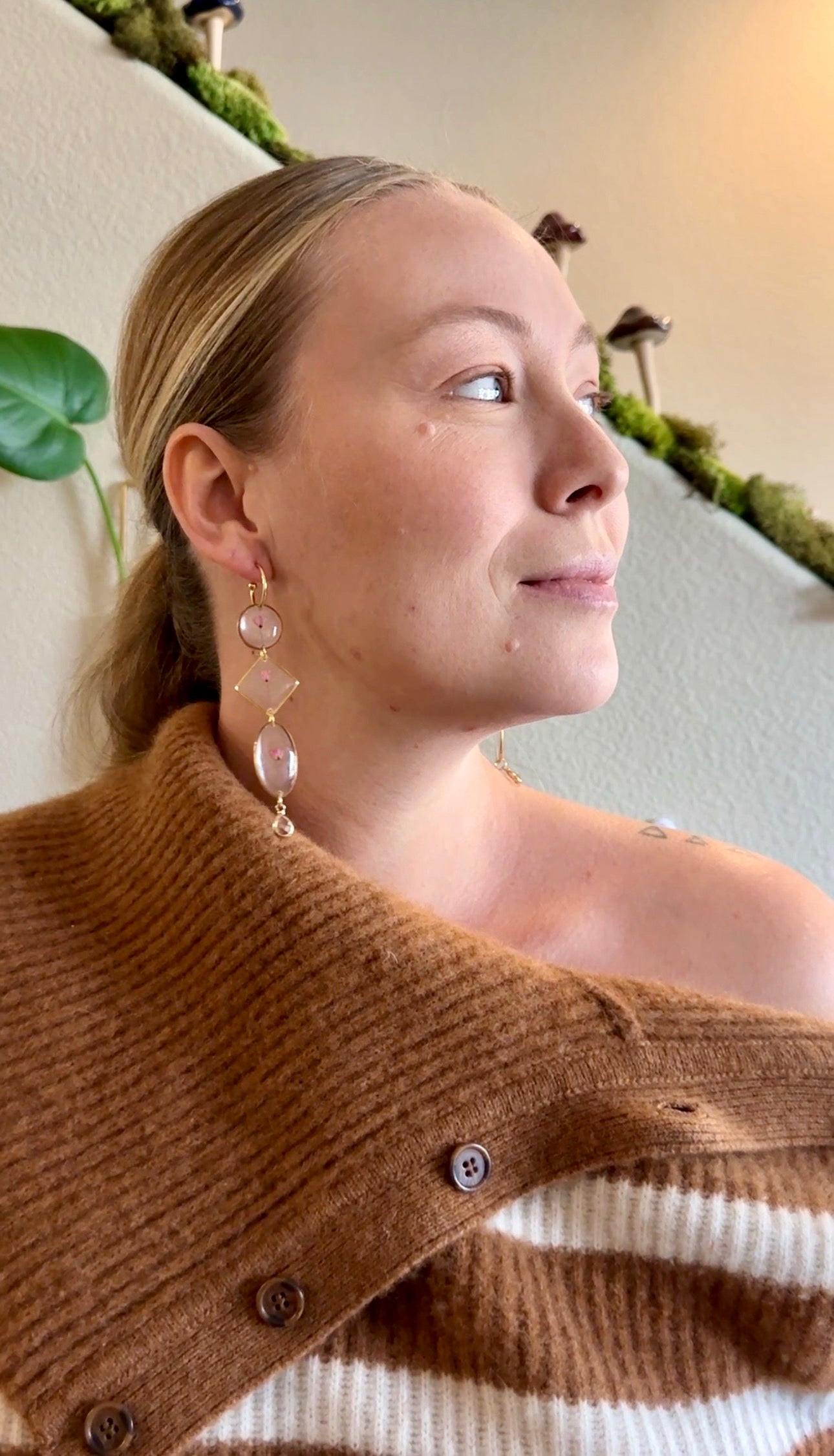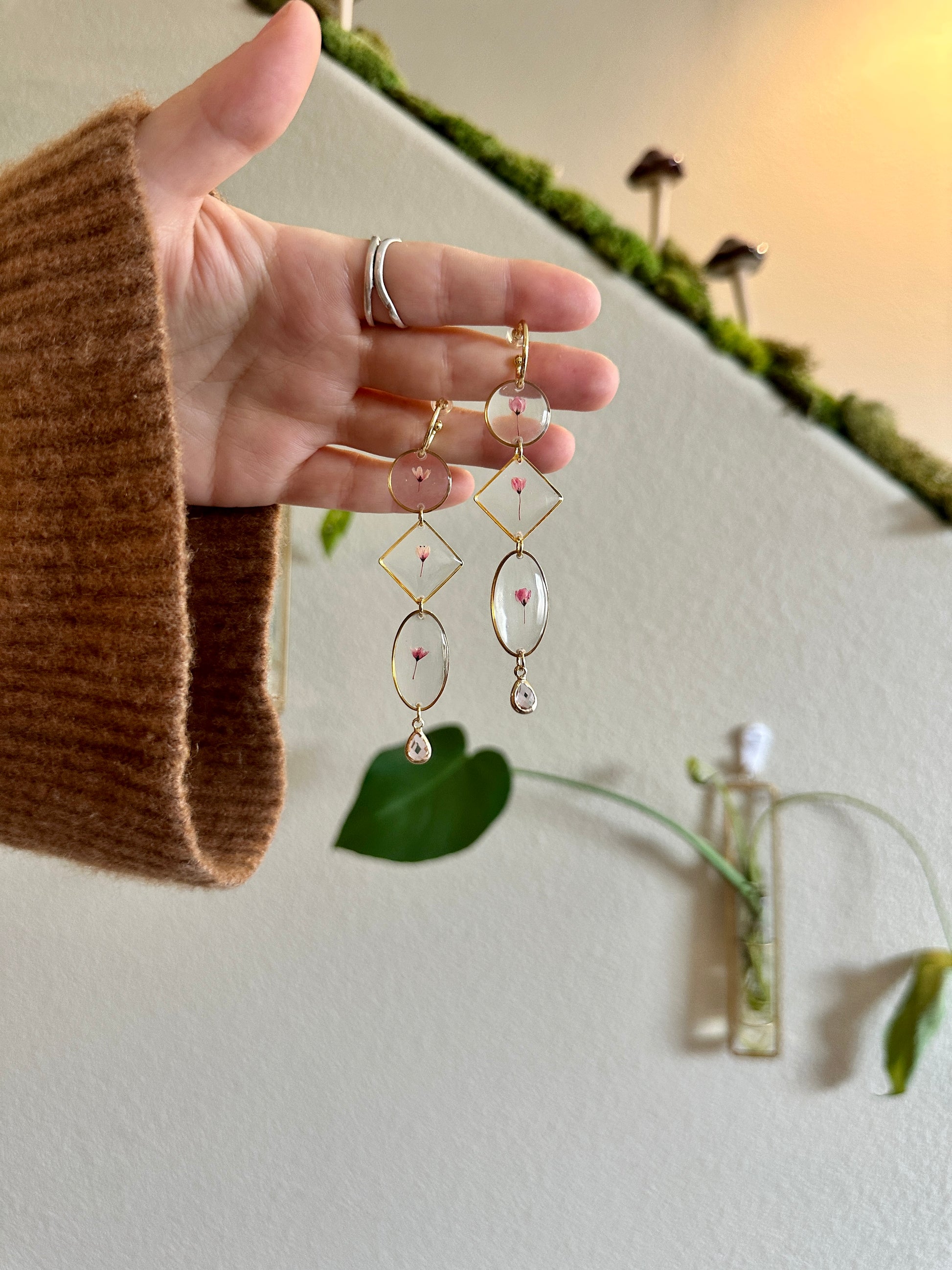 Pressed pink blossoms in resin charms and pink glass charms on gold stainless steel earring hooks.
