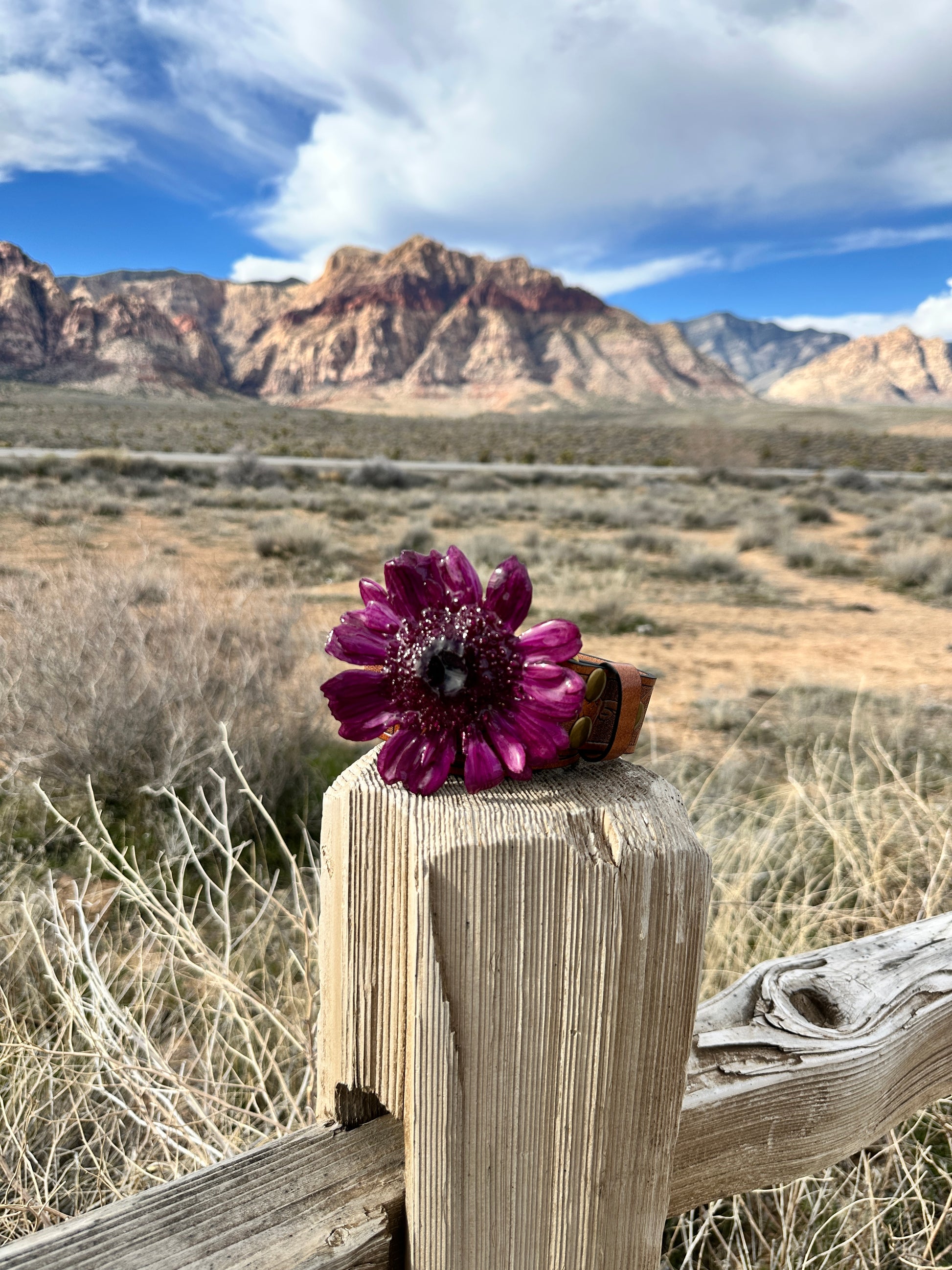 Preserved purple Gerber daisy flowers on a 1 1/2” leather belt. Belt Strap Size: Length 39"/100cm, for 29-35" waist. Custom belt buckles available. Please use the custom order form to inquire about different flowers. Belt buckles are removable and can be added to other belt straps.