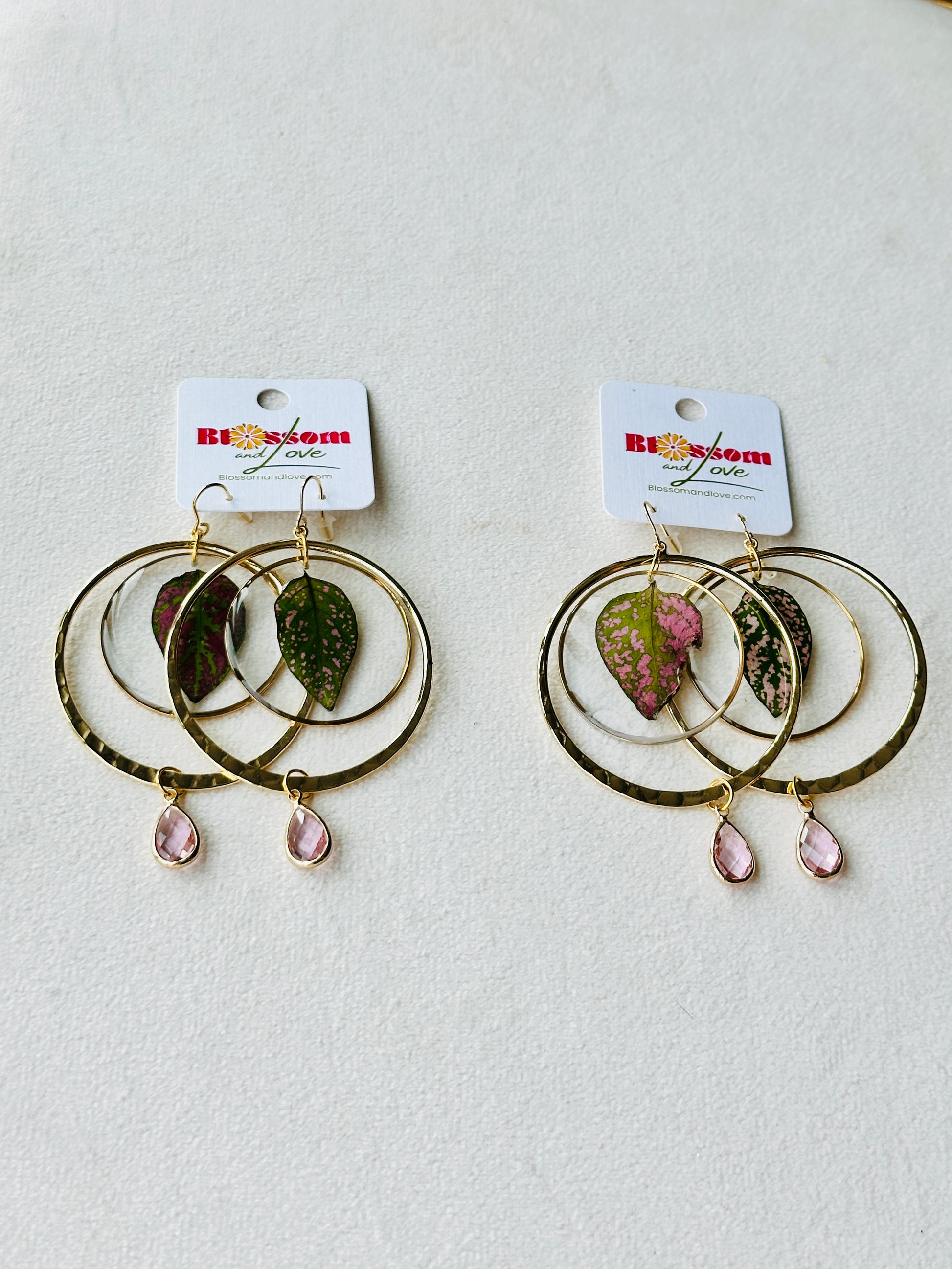 Preserved pink and green polka dot plant leaves in resin on hammered gold hoops and pink glass charms with gold stainless steel earring hooks.