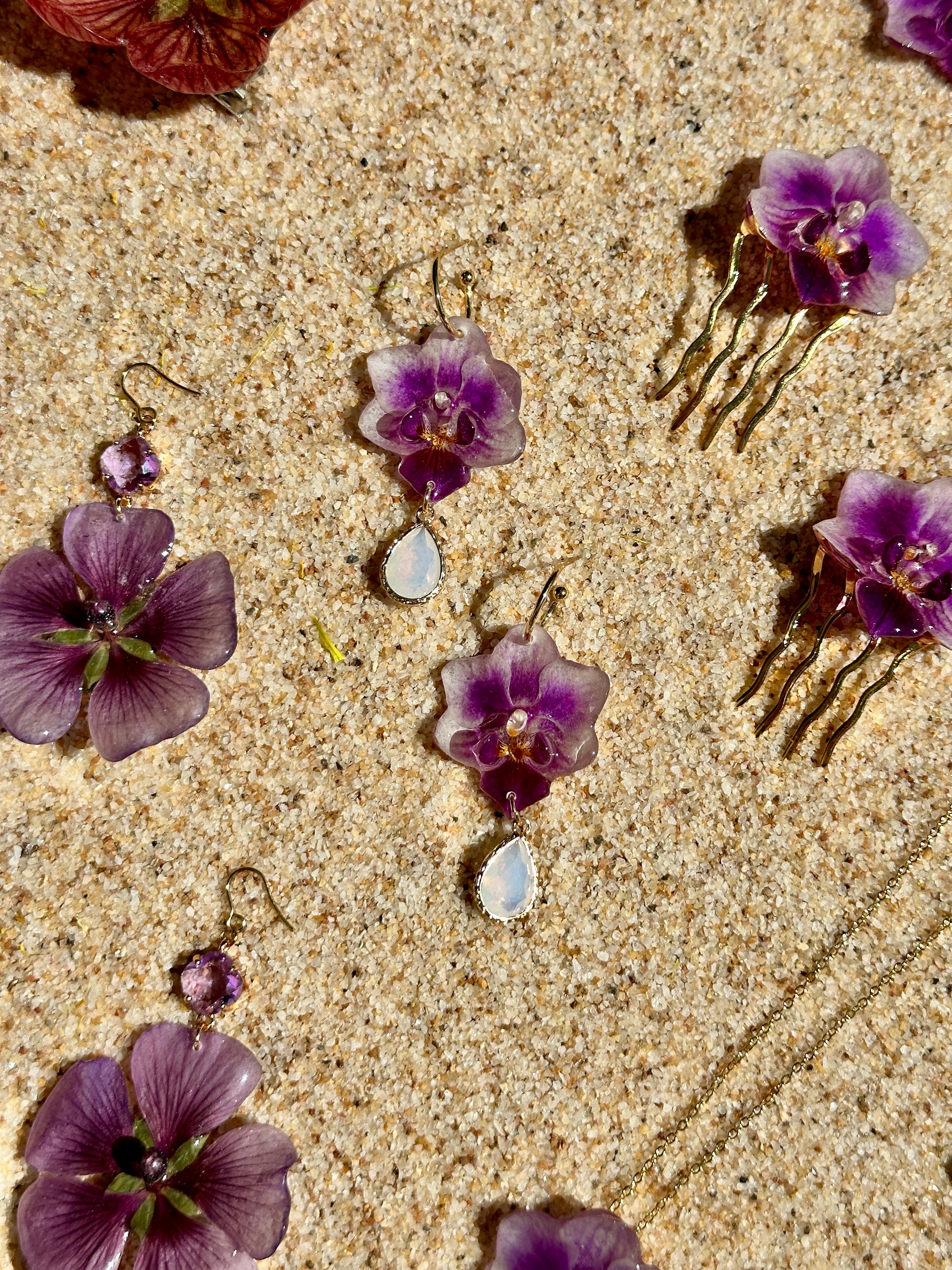 Preserved mini purple Orchids in resin with opalite charms on 14k gold filled Huggies.