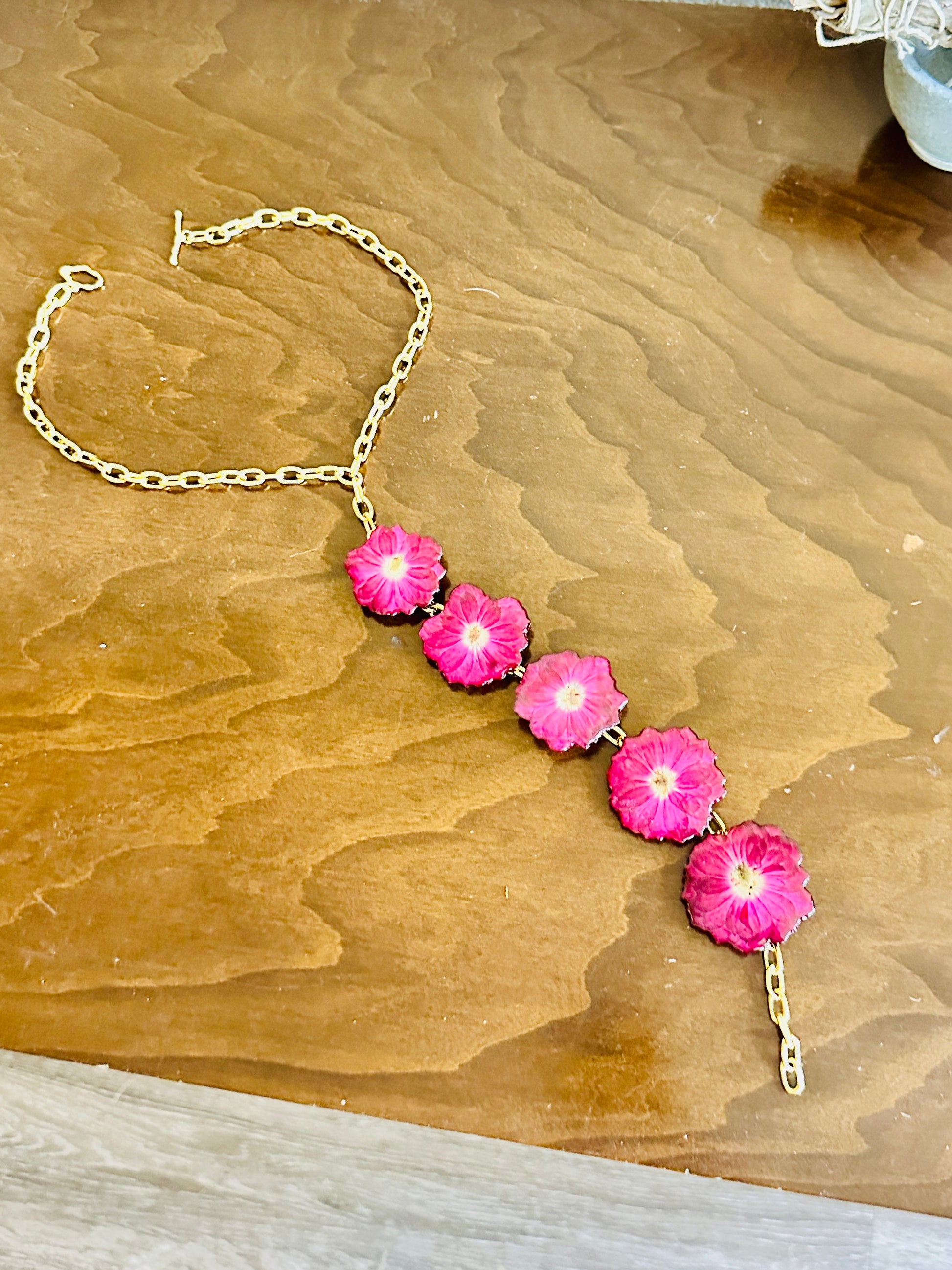 Pressed red roses in resin on gold stainless steel paperclip chain. Necklace is 15” around neck.
