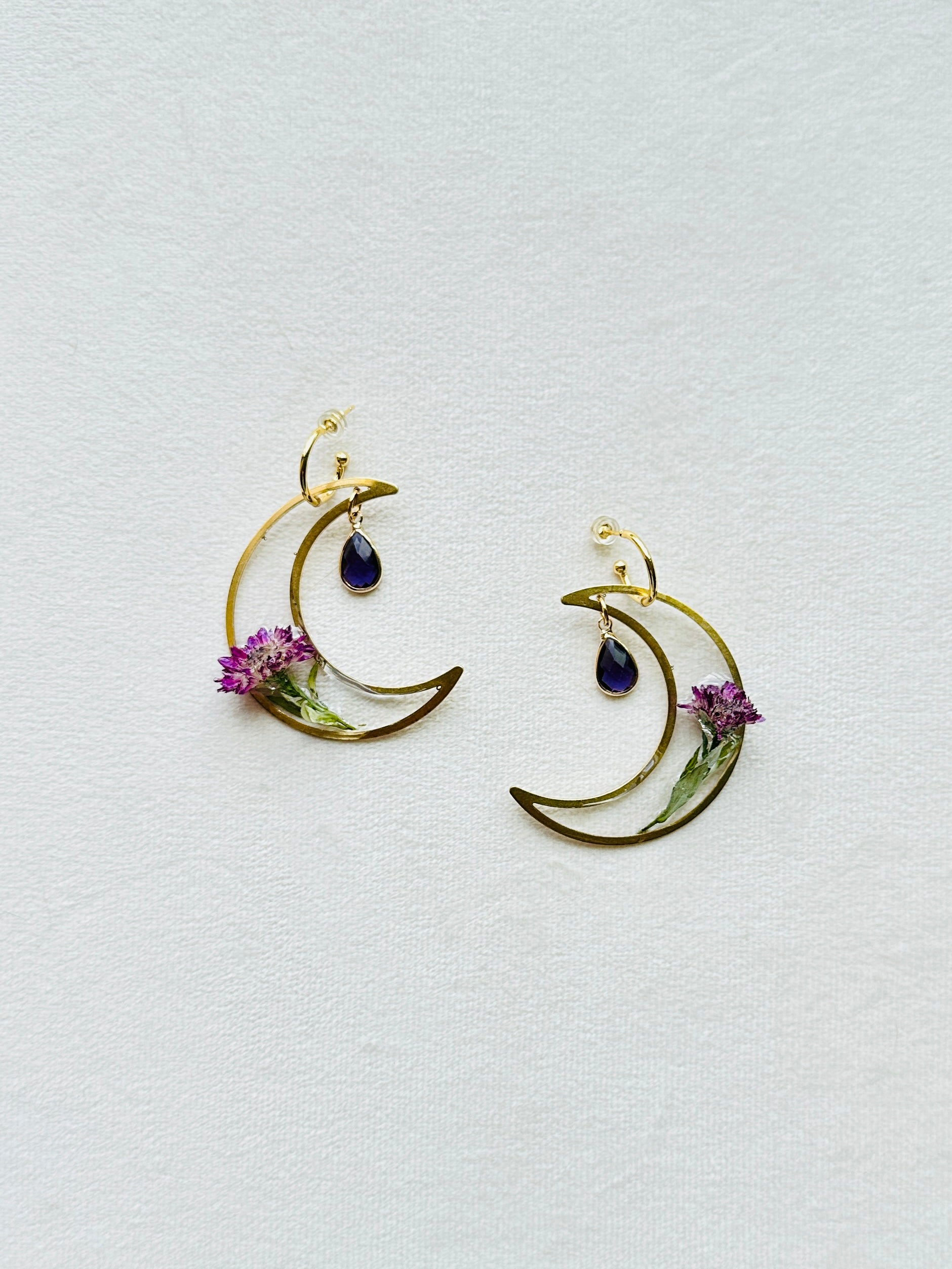 Preserved purple aster in brass resin moons with purple glass gems on 18k gold filled Huggies.