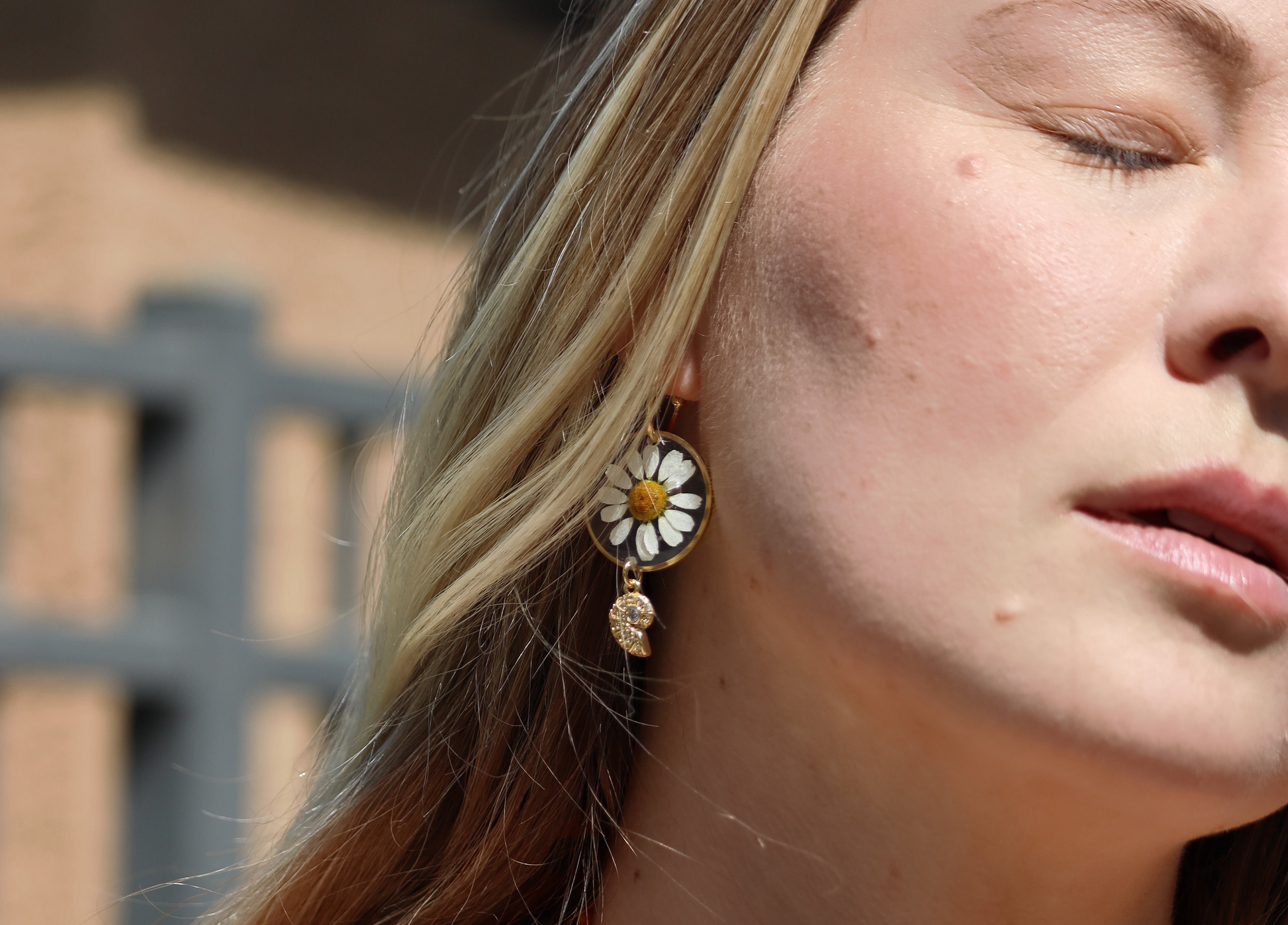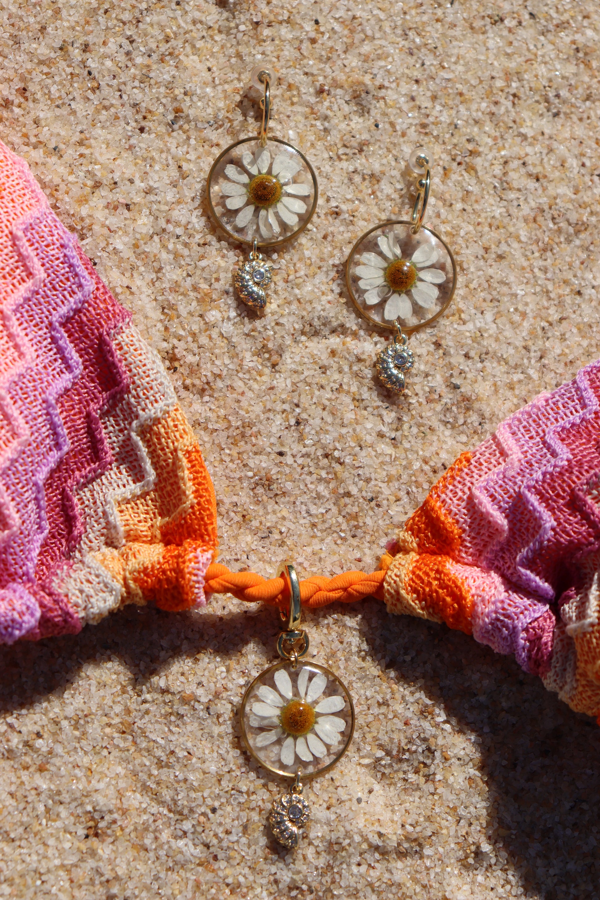 Preserved chamomile flowers in resin charms with nautical zirconia studded shell charms on 14k gold filled Huggies. Earrings are water resistant.