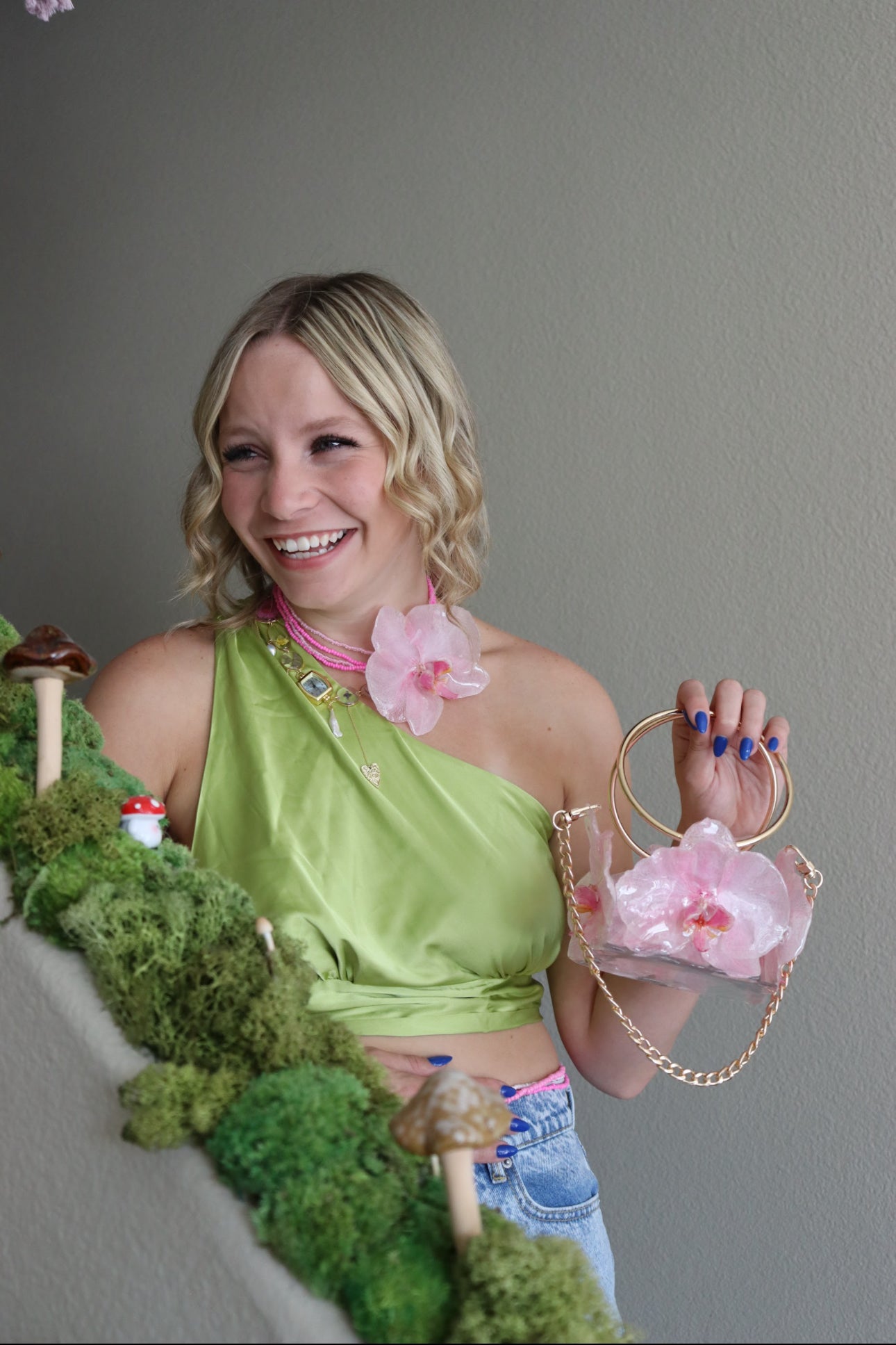 Large pink orchids preserved in resin with gold hardware. Purse comes with black coin purse. All purses are one of a kind, made from real flowers.