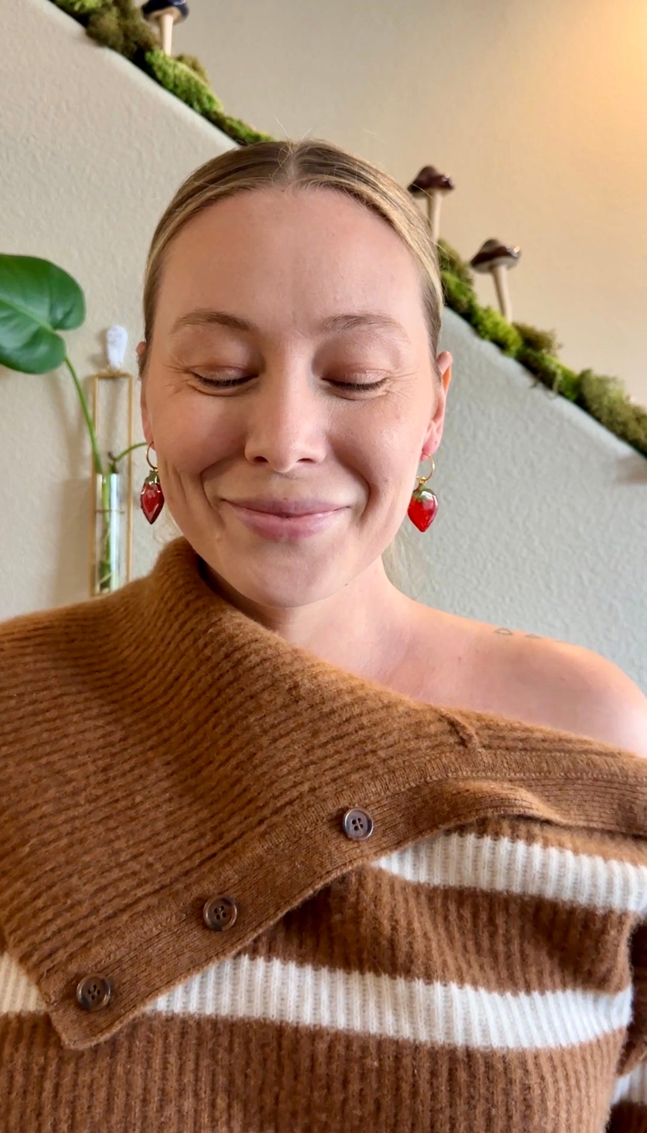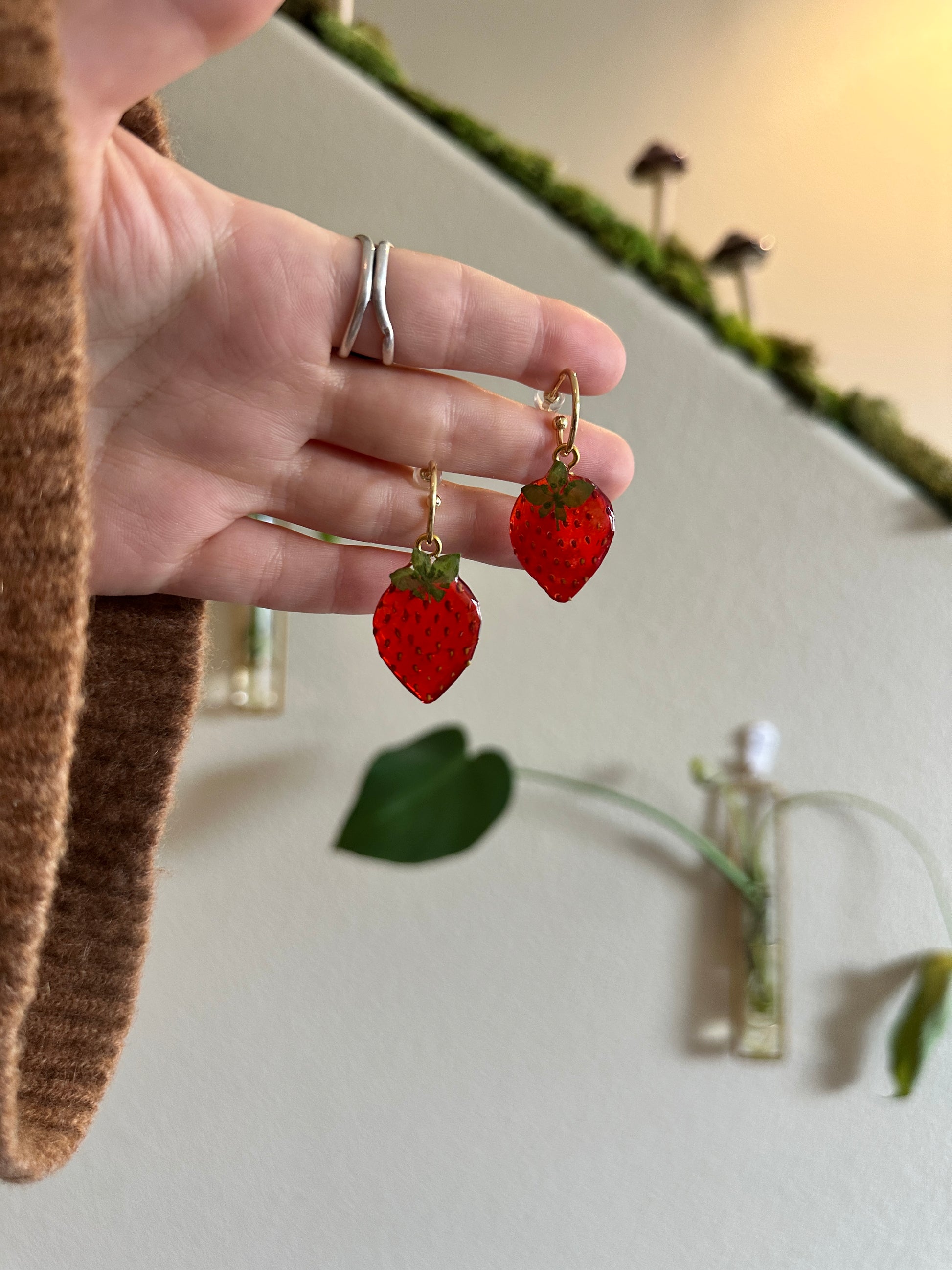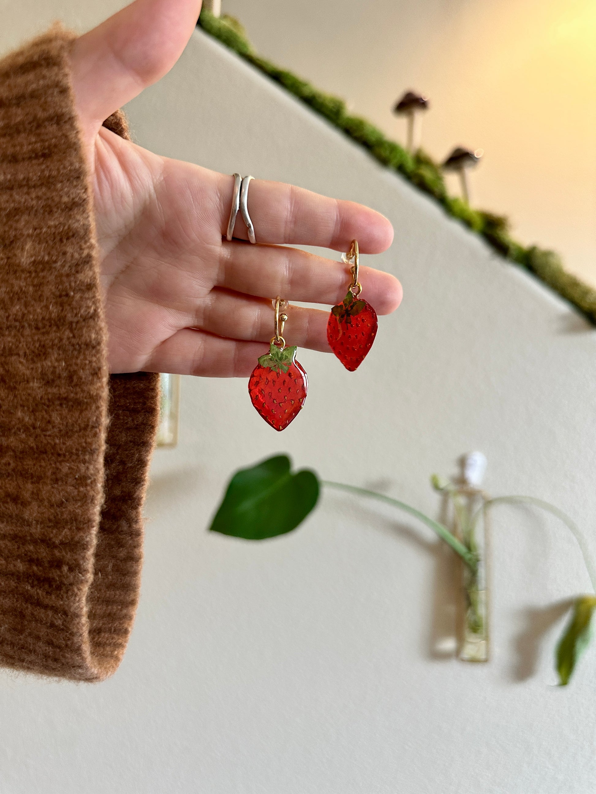 Preserved strawberry slices in resin on 14k gold filled Huggies.