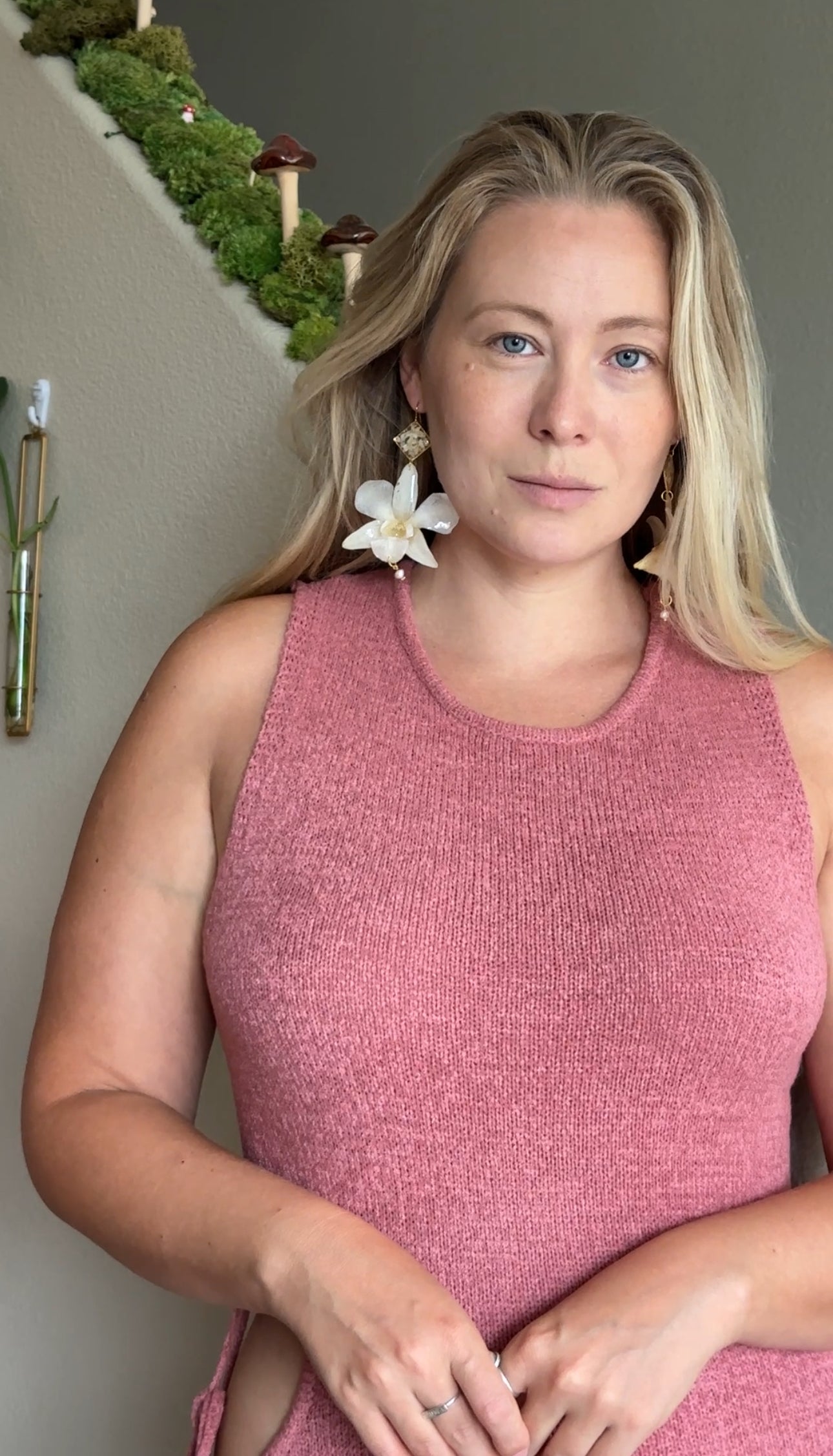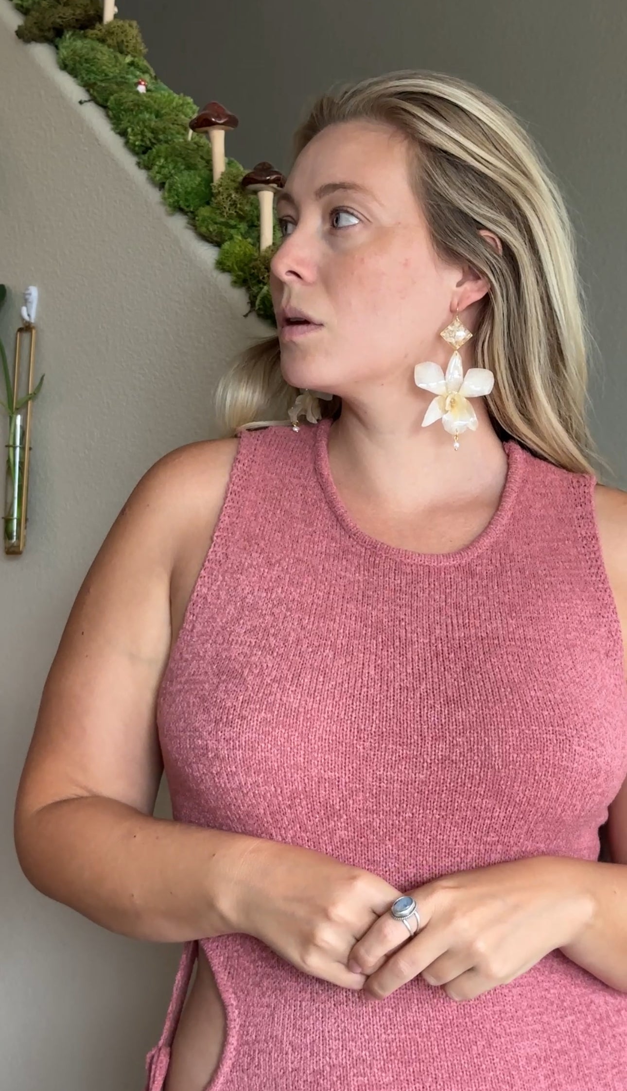 Preserved white dendrobium orchids in resin with crushed orchid petals and freshwater pearl charms on gold stainless steel earring hooks.