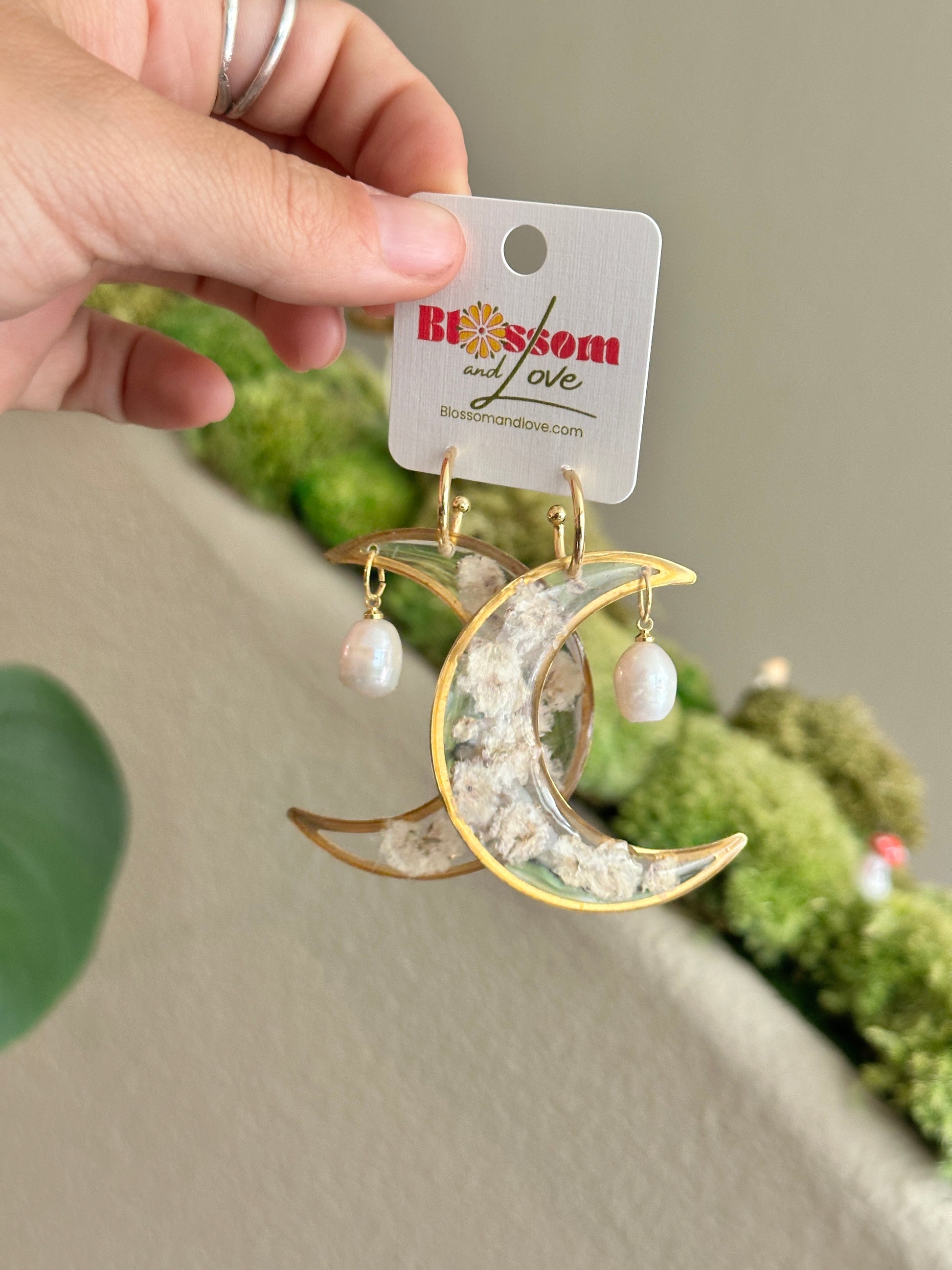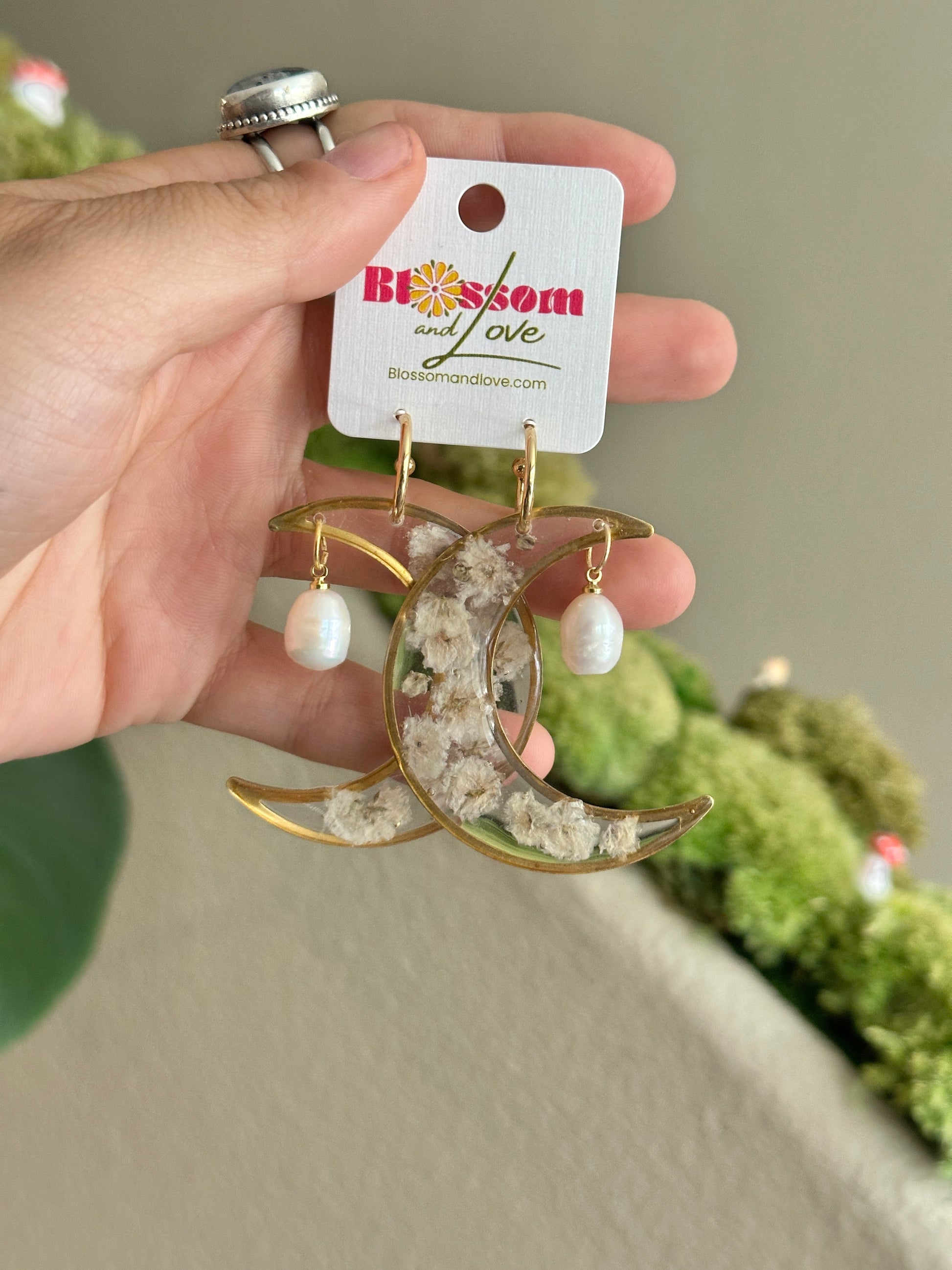White babies breath preserved in brass moons with freshwater pearls on 14k gold filled Huggies.