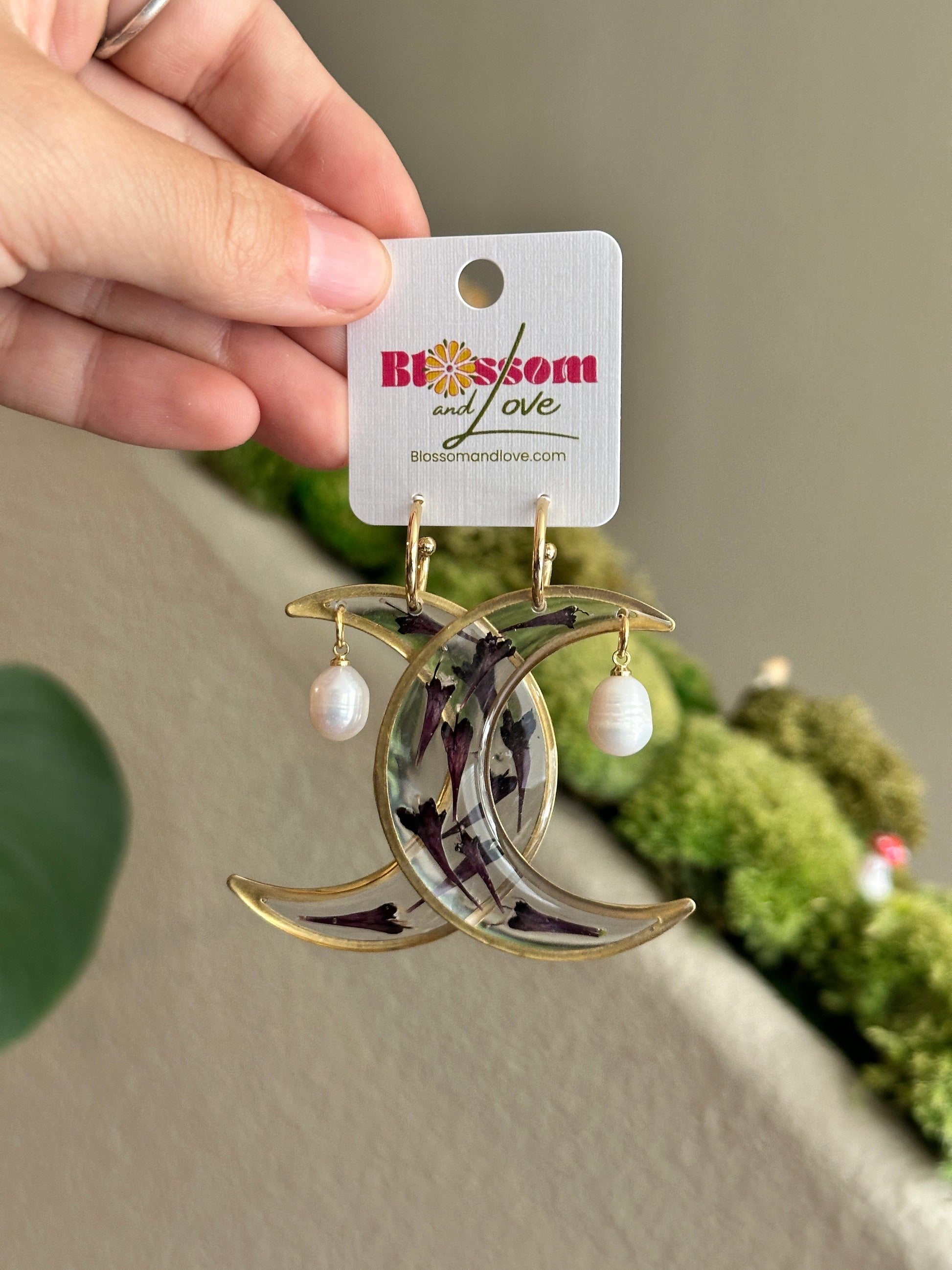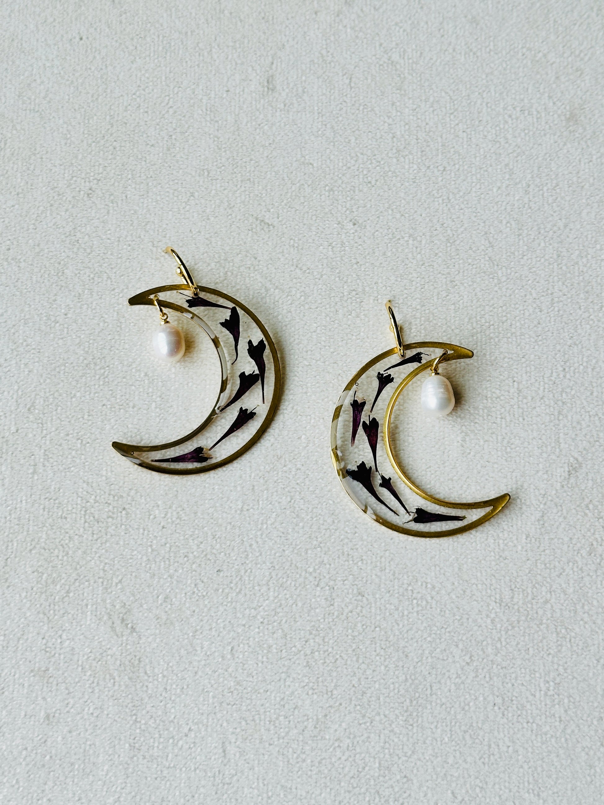 Pressed black flowers in resin moons with freshwater pearl charms on 14k gold filled Huggies.