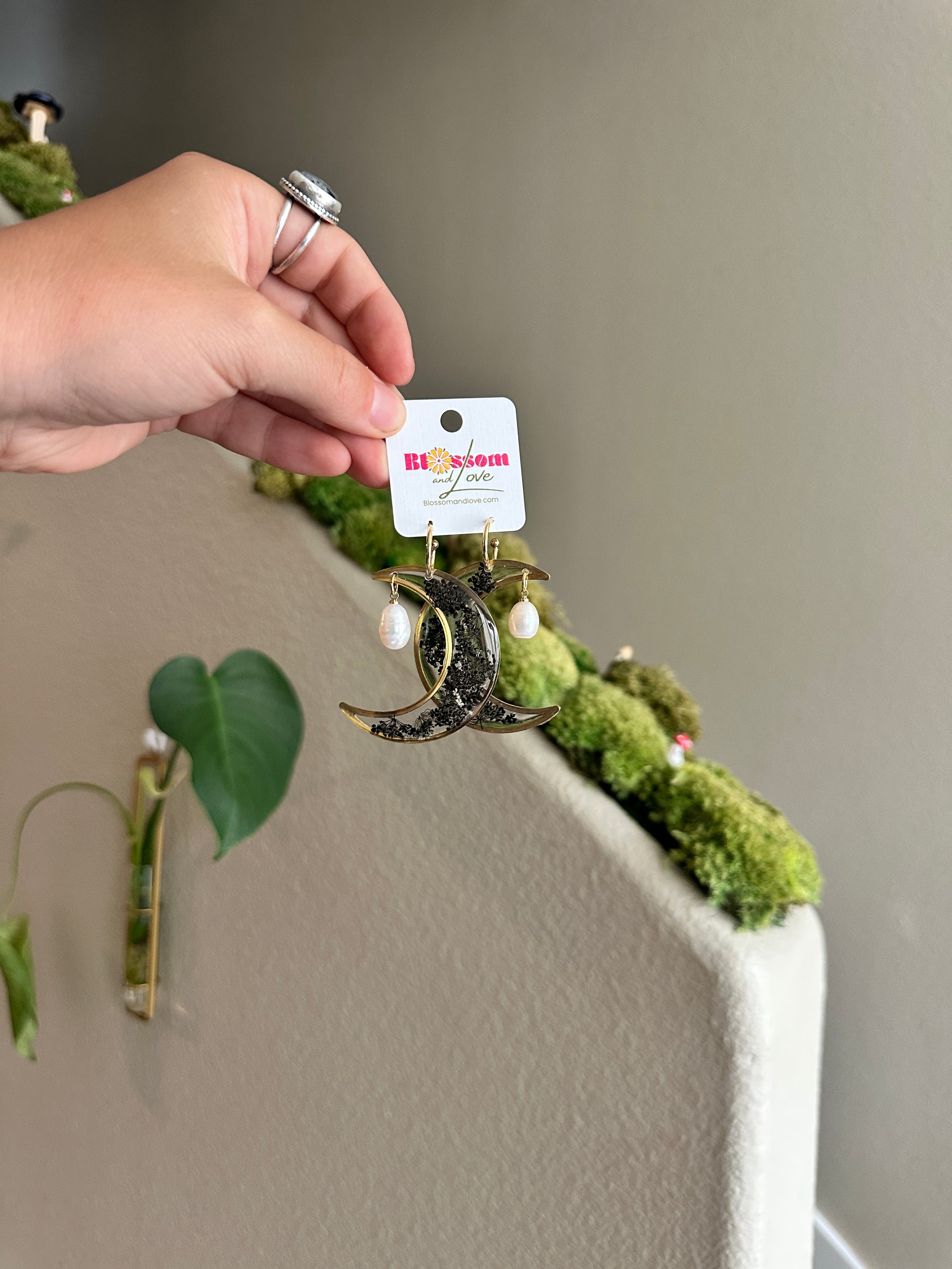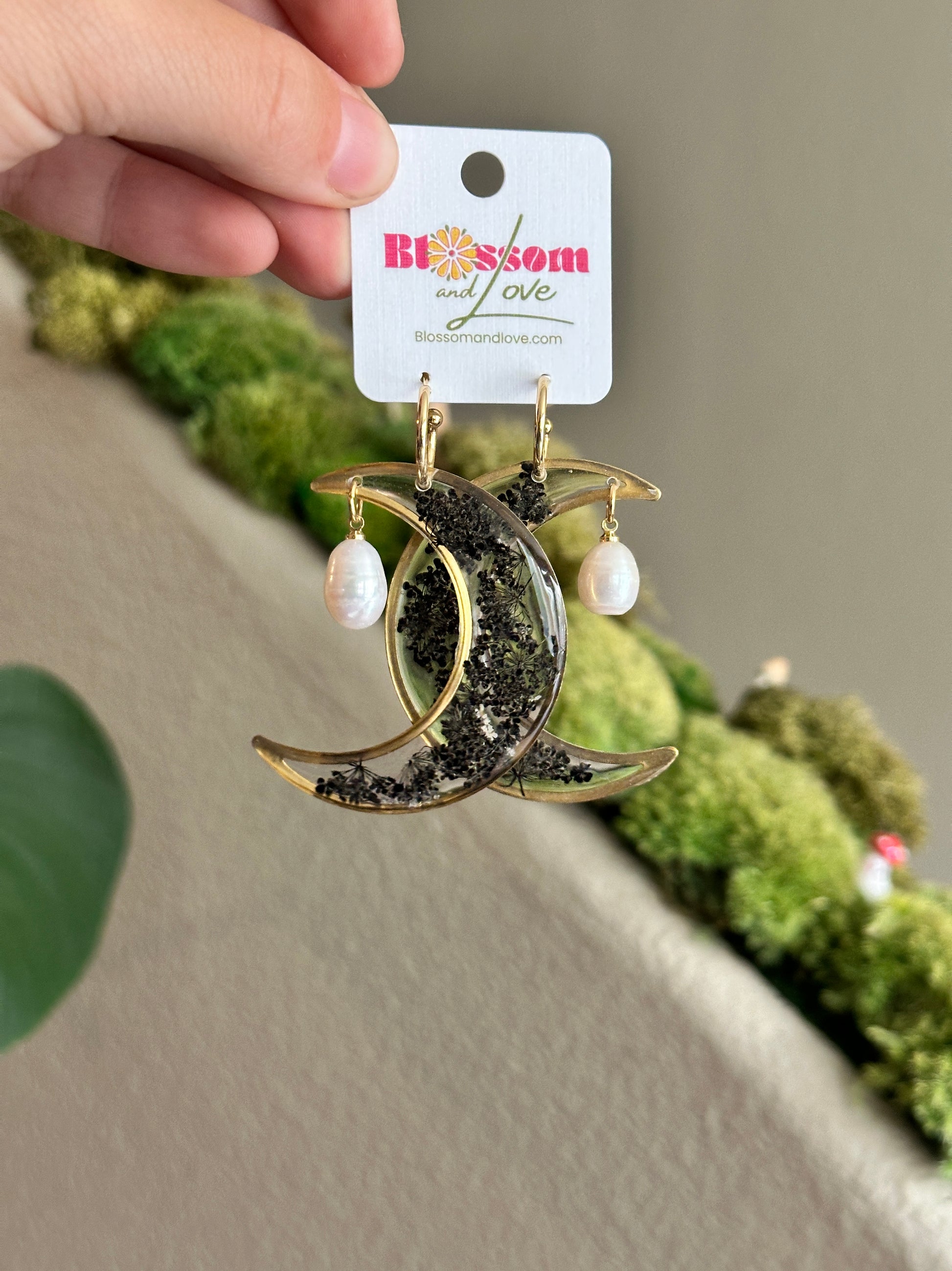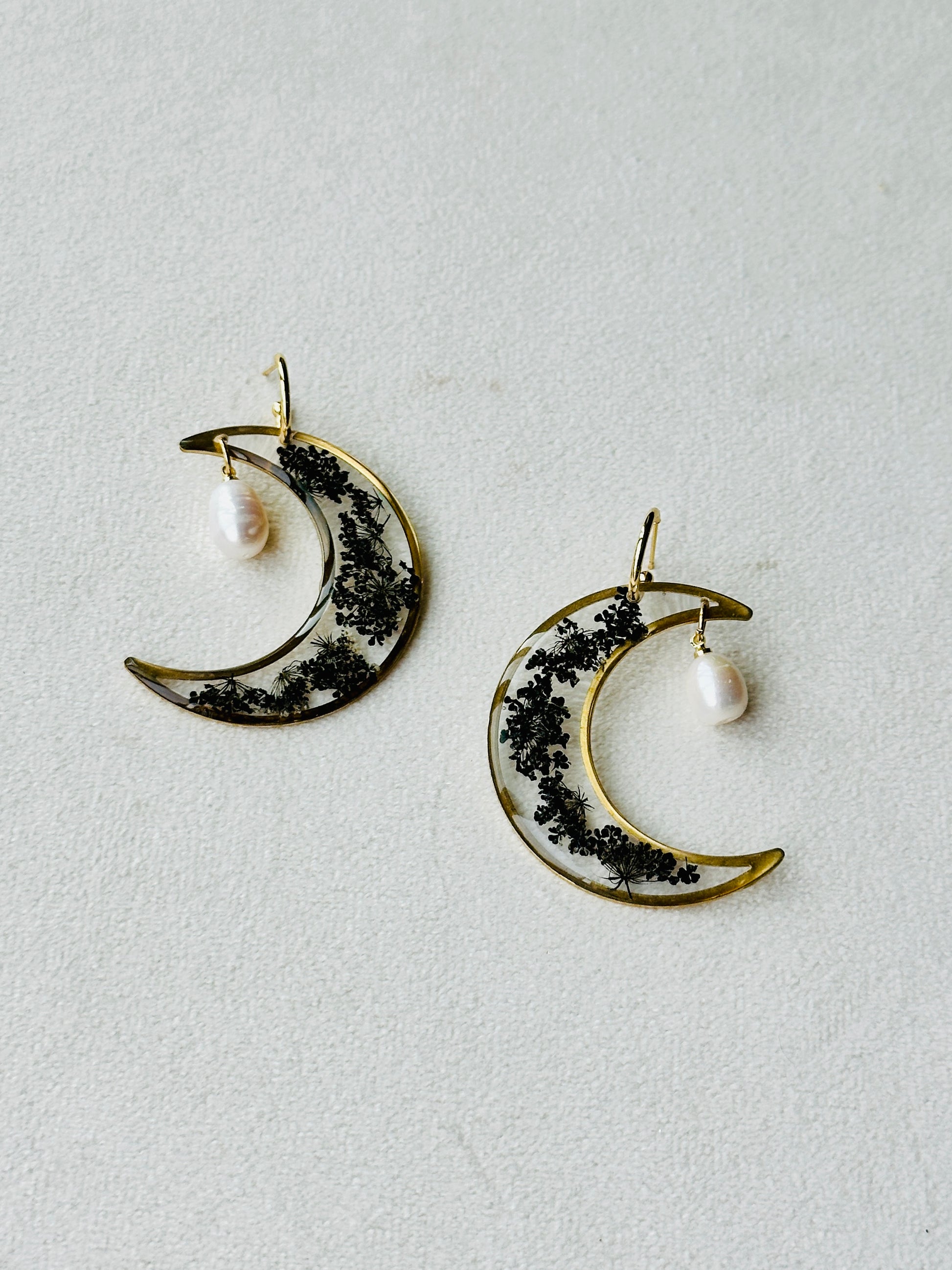 Preserved black queen Anne’s lace in gold moons with freshwater pearls charms on 14k gold filled Huggies.