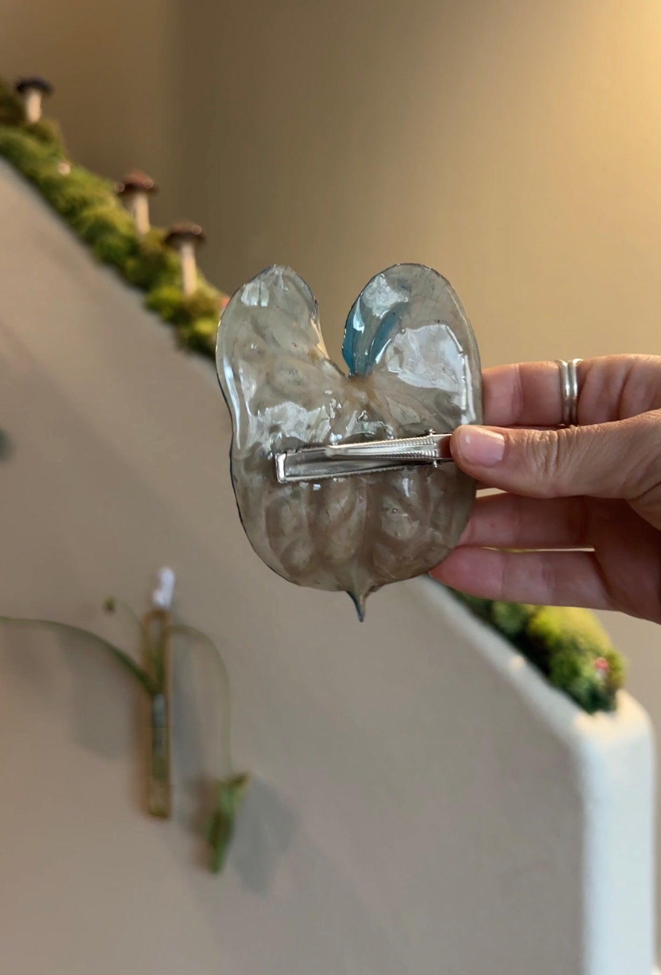 Preserved blue painted anthurium in resin on hair clips.