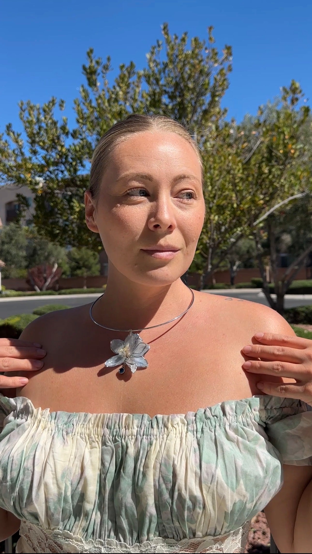 Preserved delphinium in resin with a silver outline on a stainless steel wire choker.