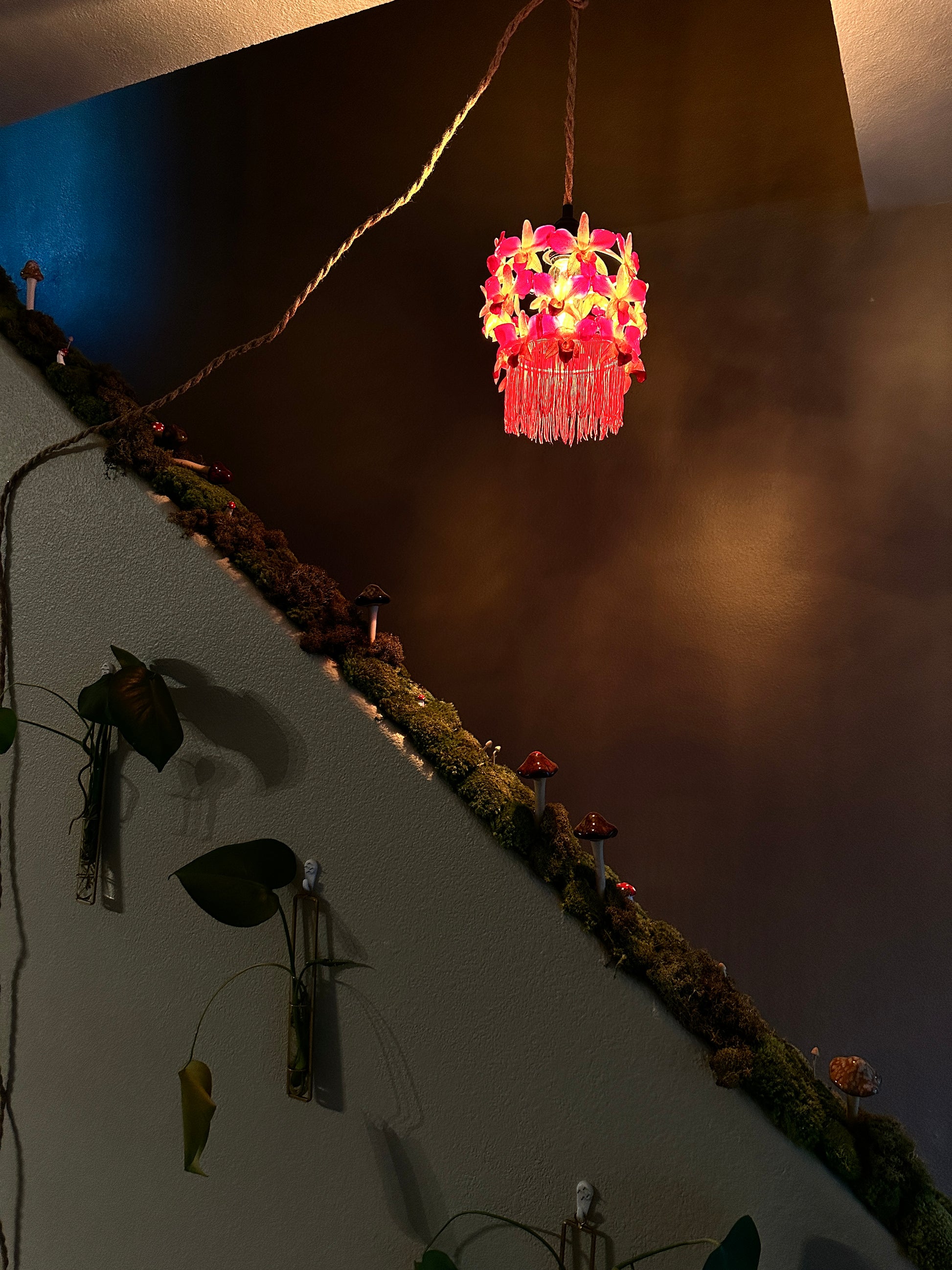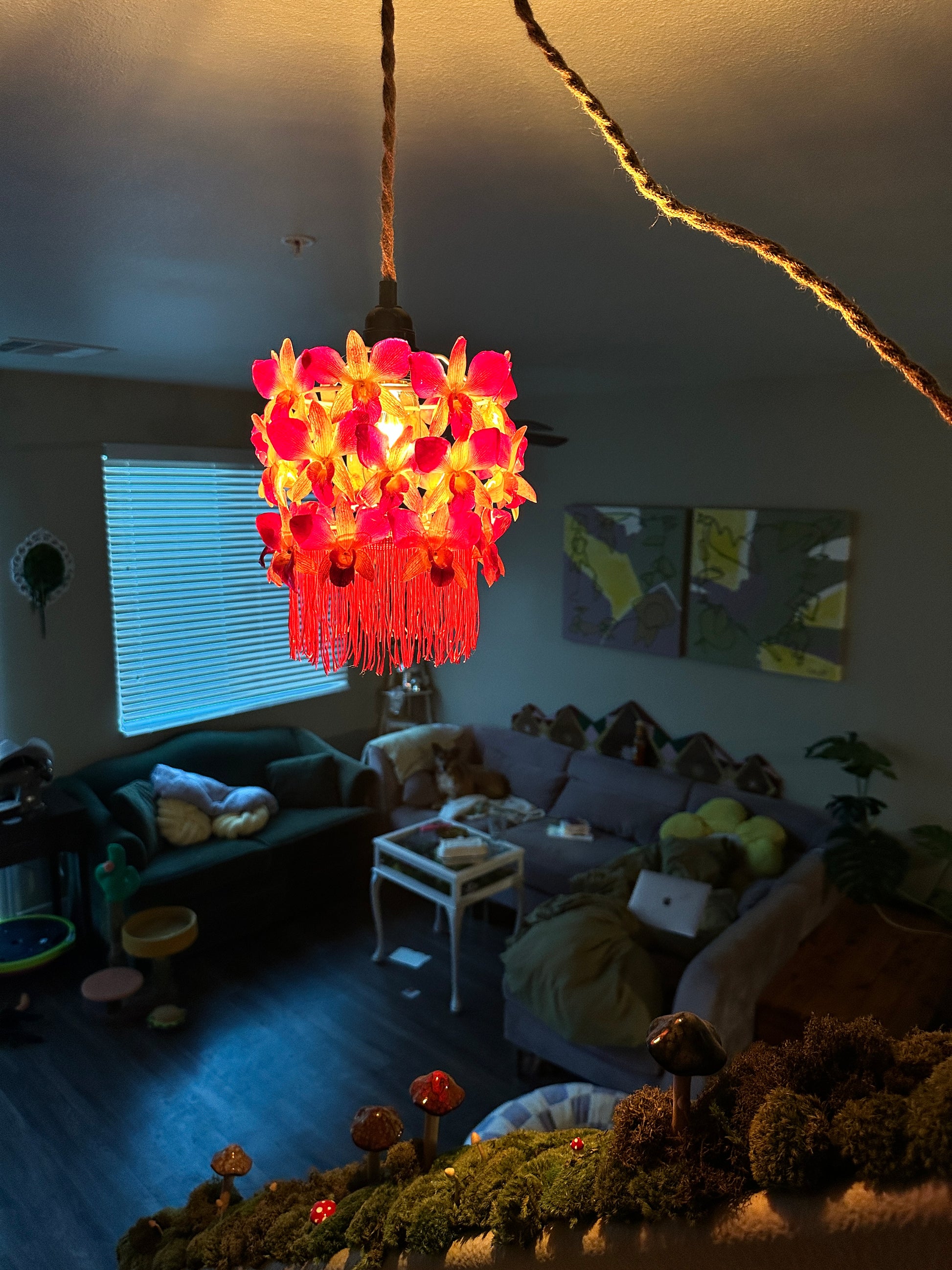 Preserved pink dendrobium orchids preserved in resin on a hanging lamp shape 10” wide with pink fringe. Comes with 15’ rope cord, but can be added to other lamps. Lamps are made to order with a 2-3 week creation time. Custom orders also available for different sizes and shapes.