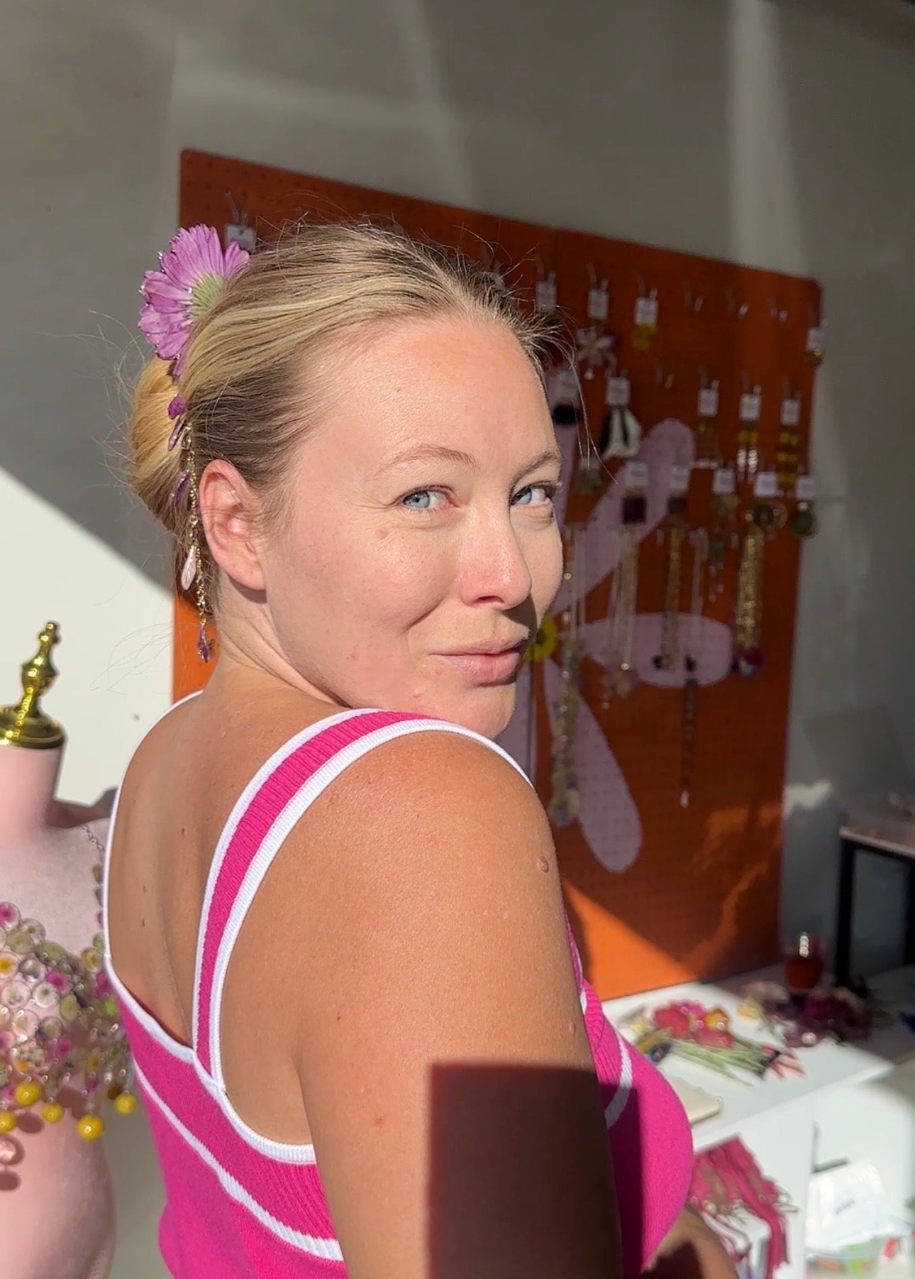 Purple Gerber daisy preserved in resin with preserved petals and purple glass charms on a French pin.