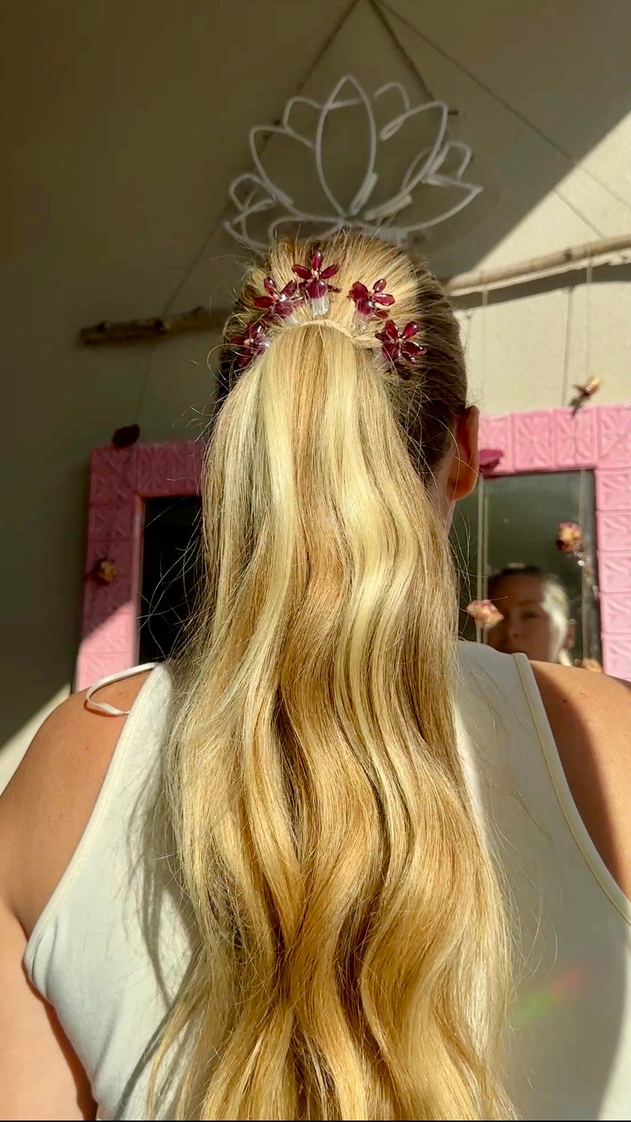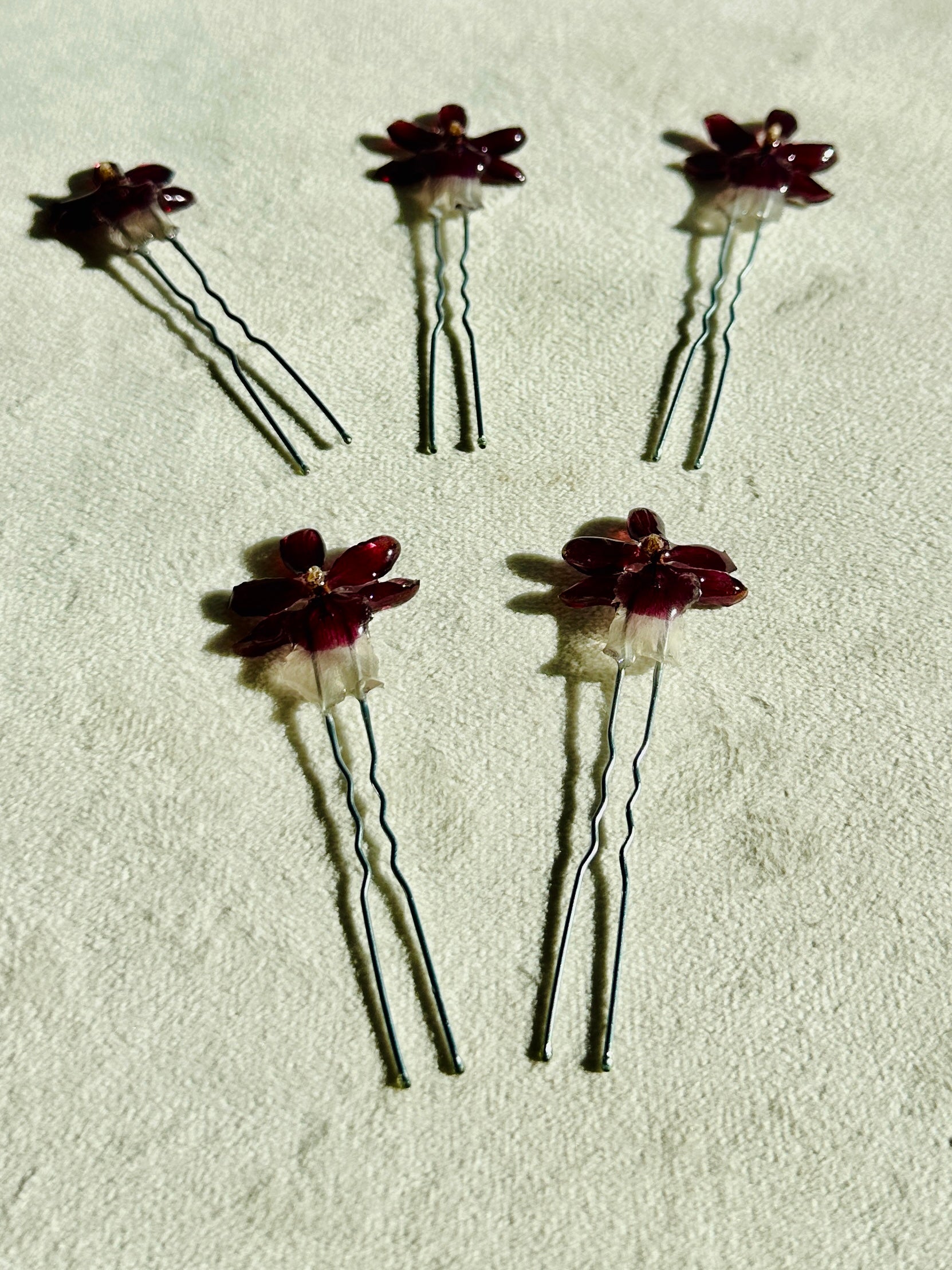Preserved mini burgundy orchids in resin on Bobby pins.