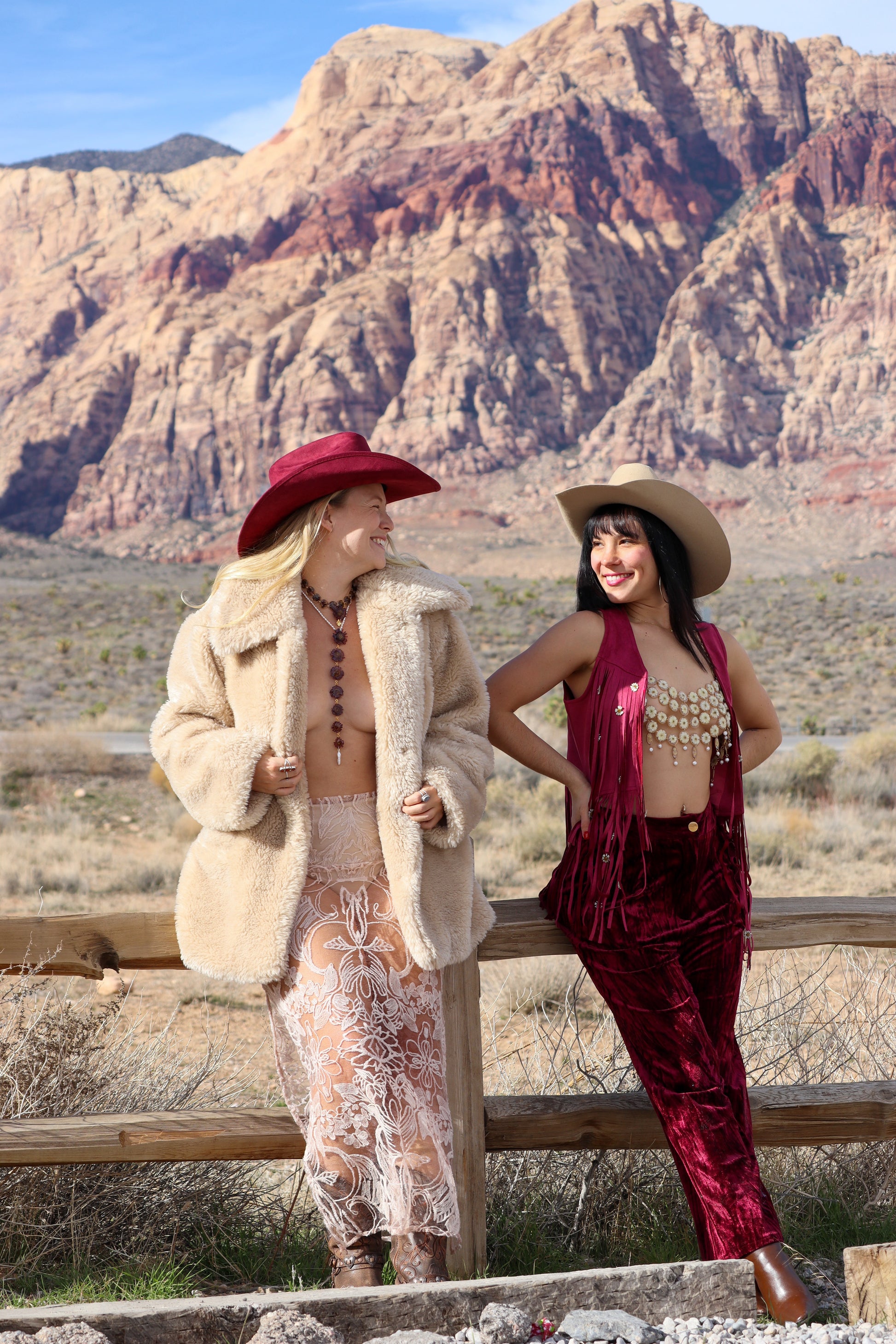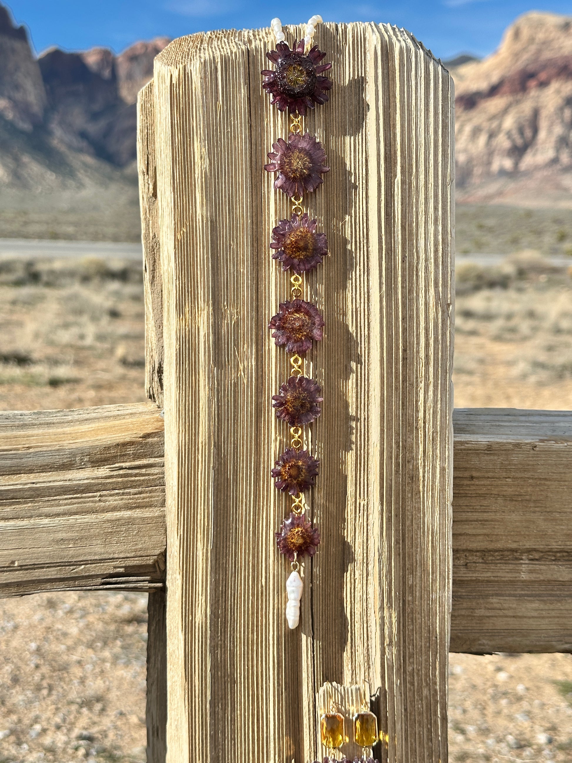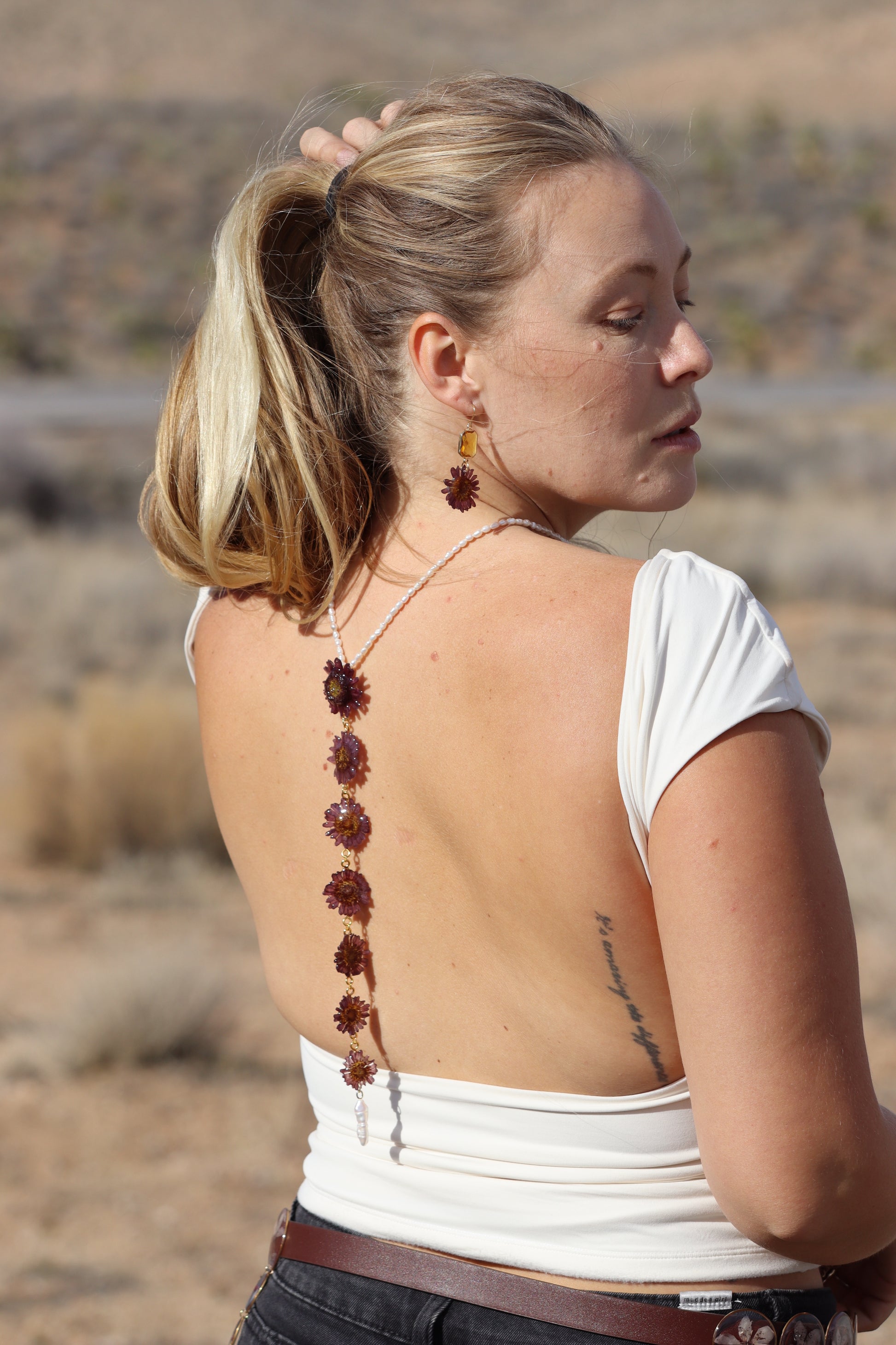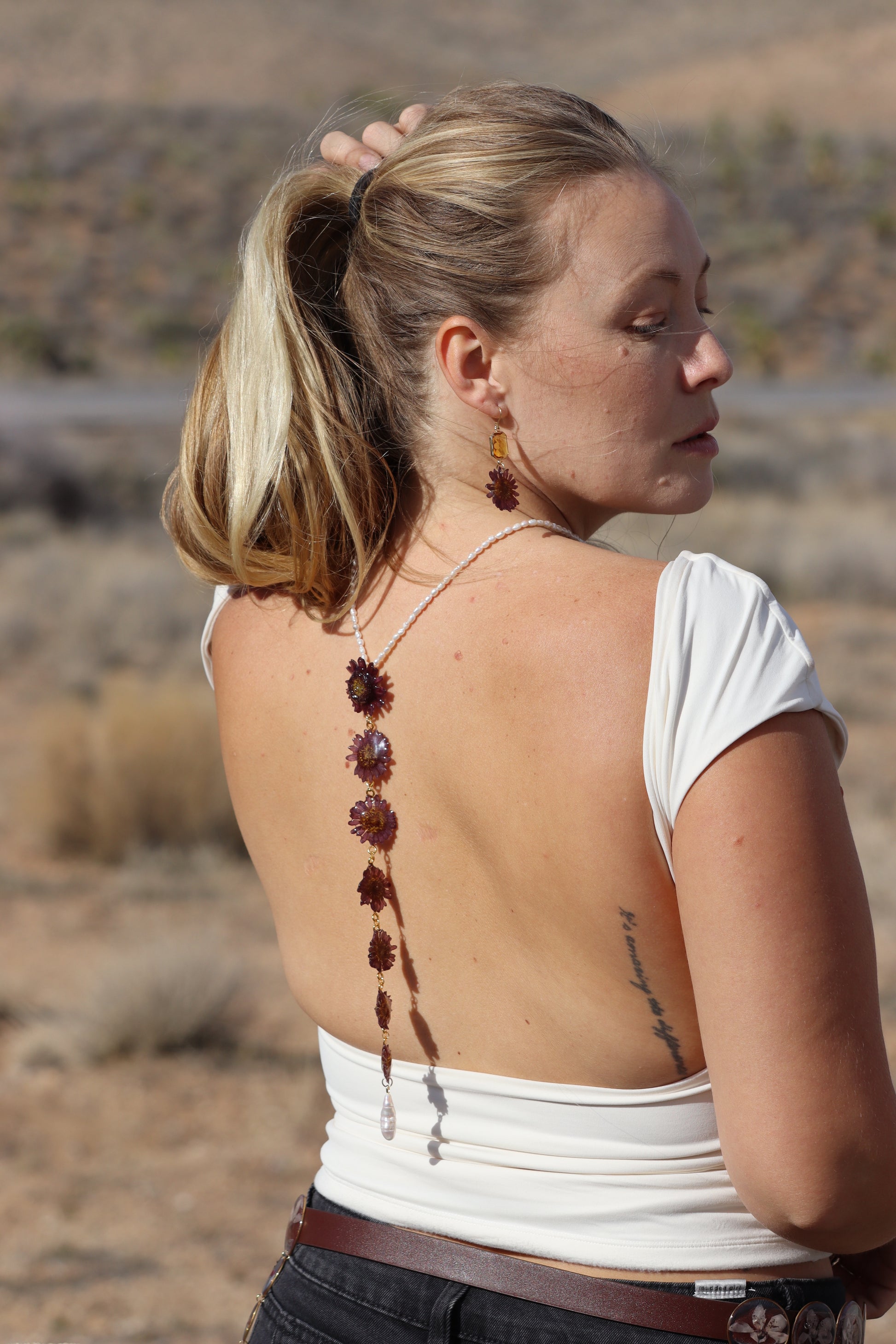 Preserved burgundy mums in resin with freshwater pearls on a 16” chain. Can be styled with an open back shirt or in the front.