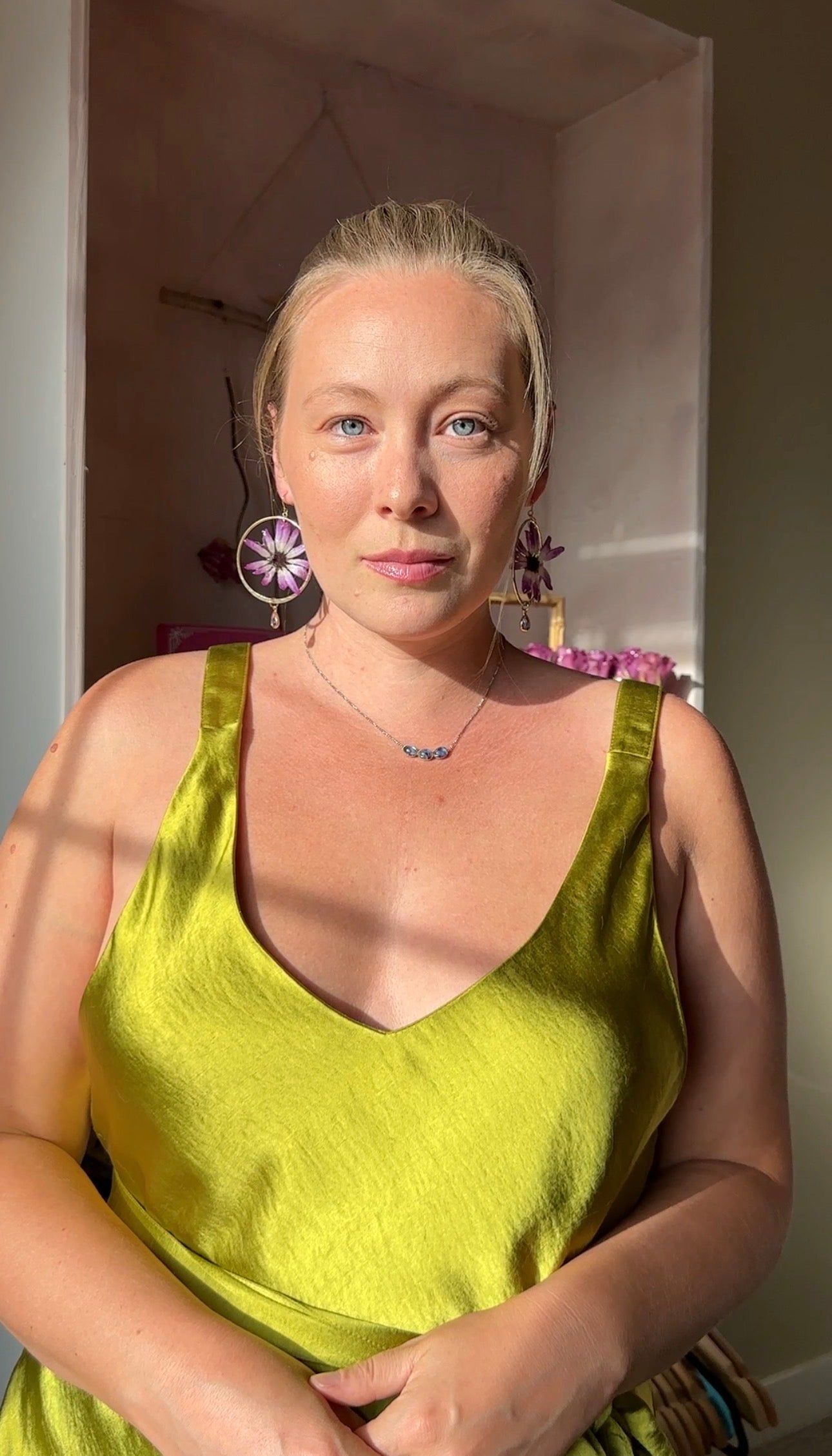 Preserved cineraria flowers in resin on hammered gold hoops with glass gems and gold, stainless steel earring hooks.