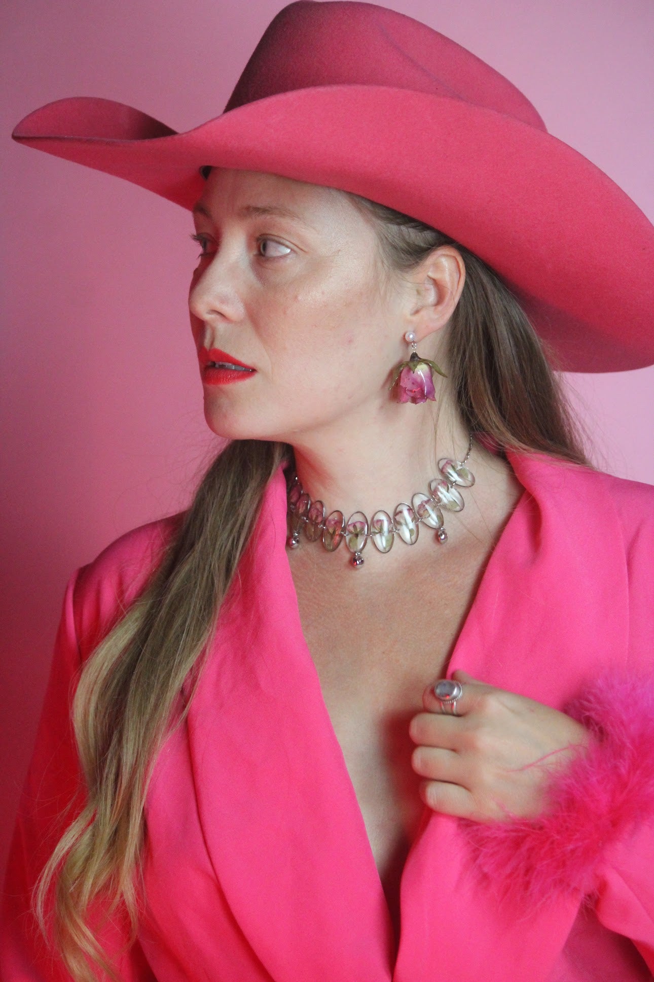 Preserved pink roses on silver stainless steel stud earrings.