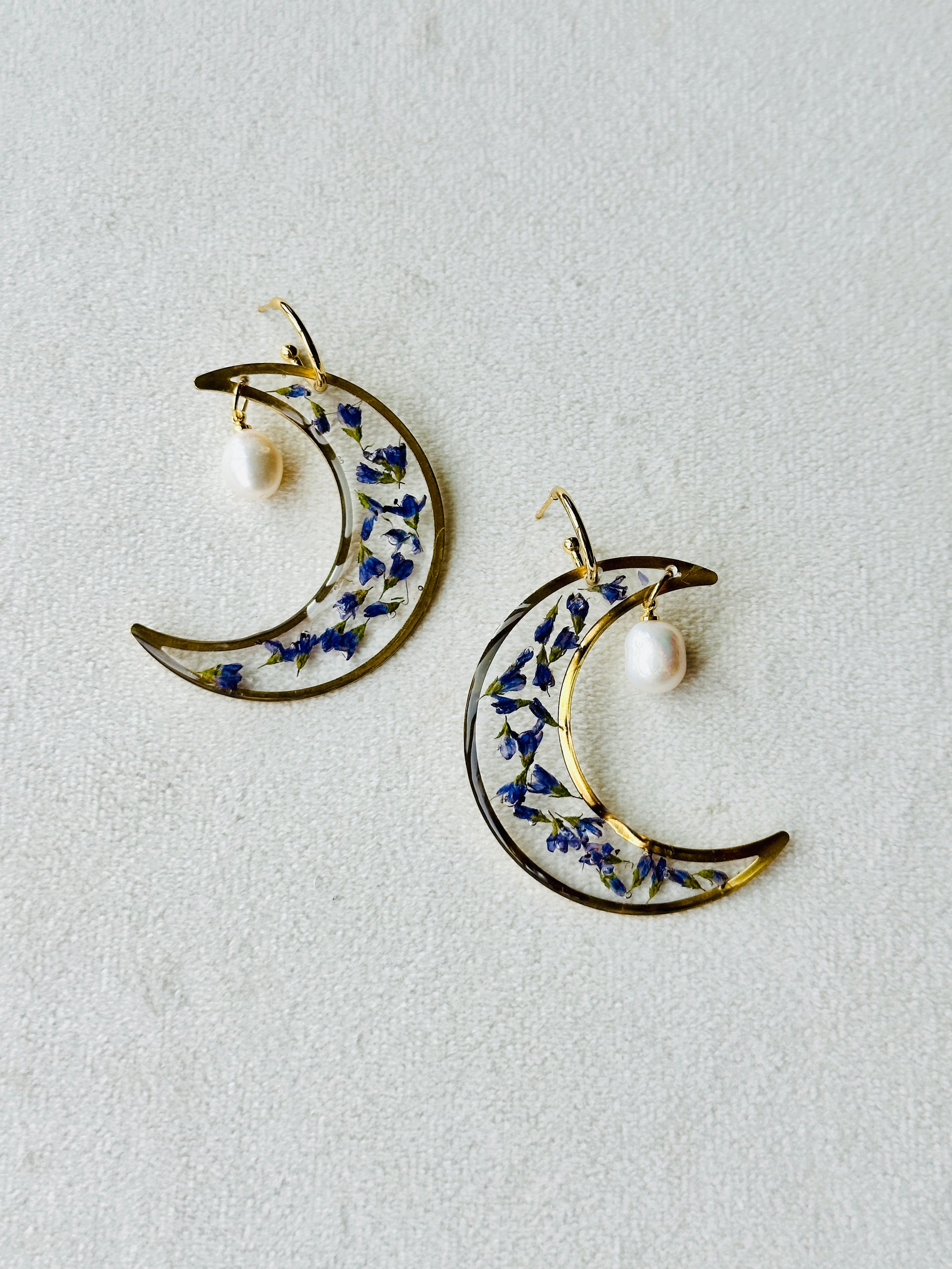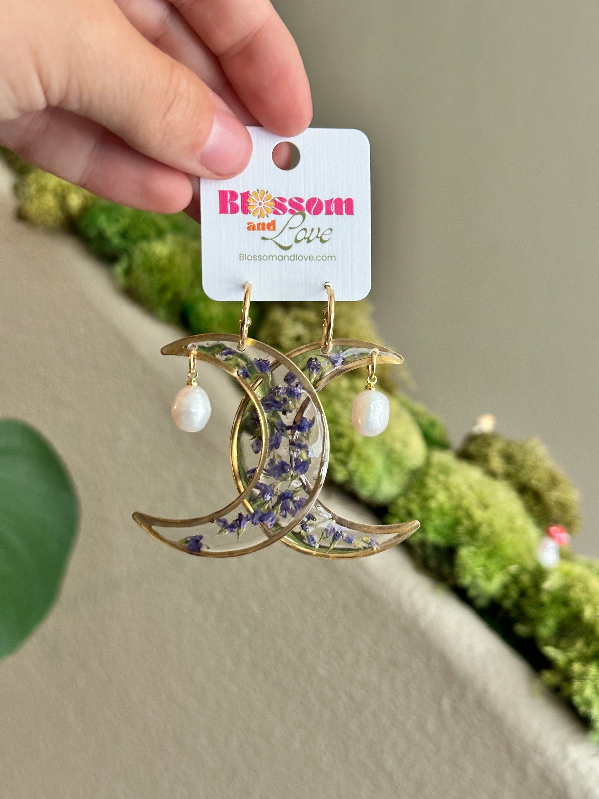 Preserved purple wildflowers in resin moons with freshwater pearls charms and 14k gold filled Huggies.