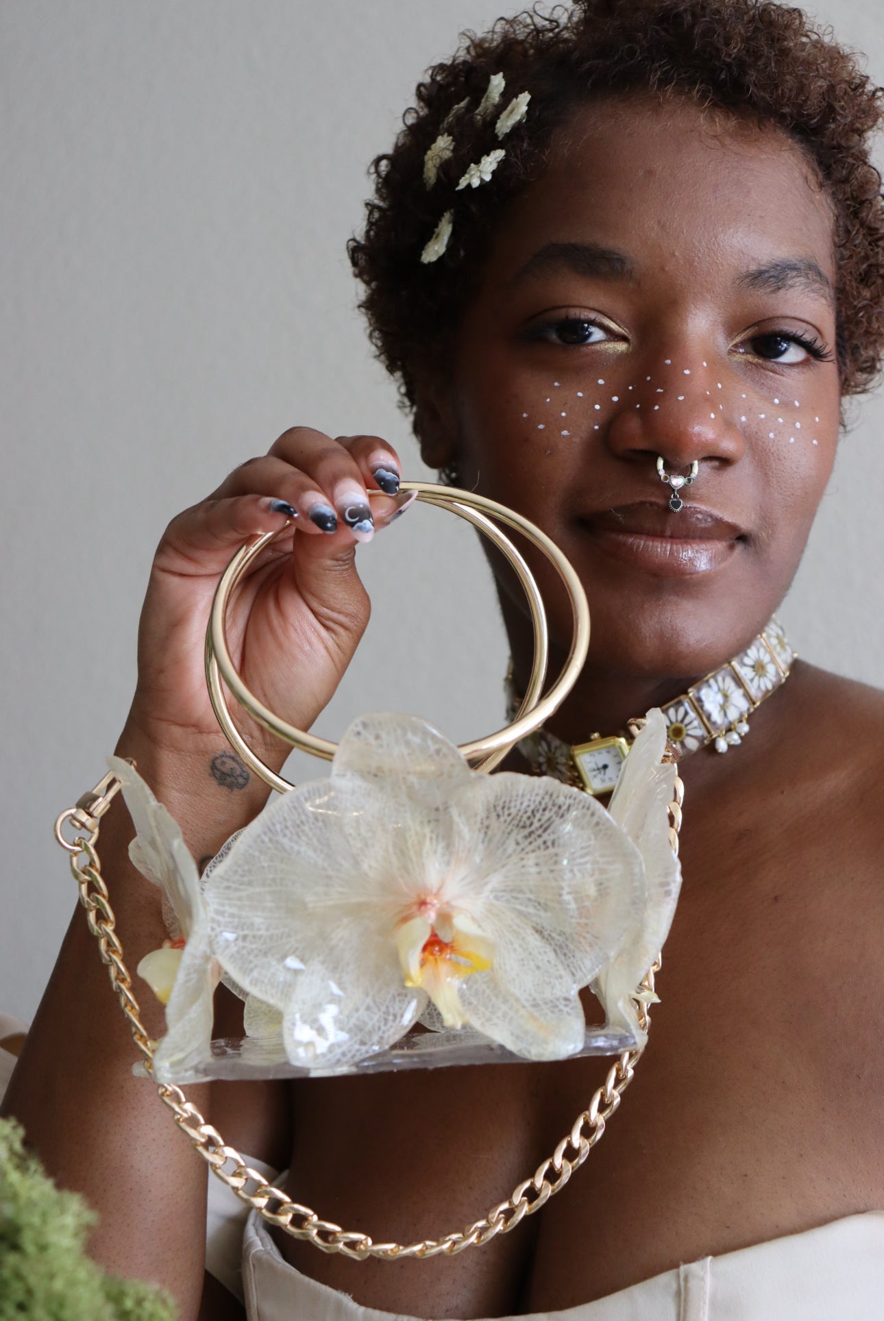 Large white orchids preserved in resin with gold hardware. Purse comes with coin purse. All purses are one of a kind, made from real flowers.