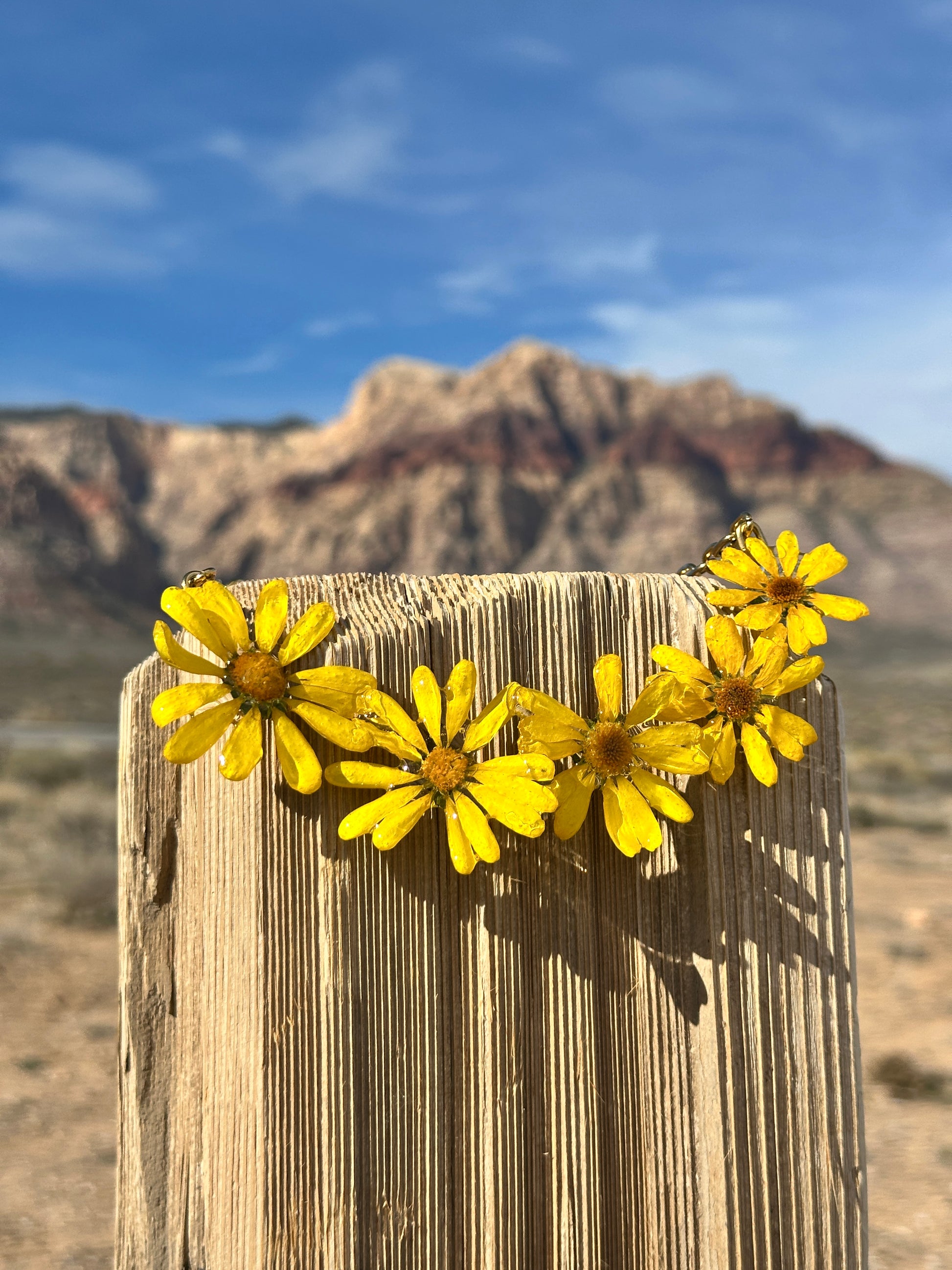 Preserved wild yellow daisies picked in Nevada in resin on a gold stainless steel paperclip chain choker. 14” in length.